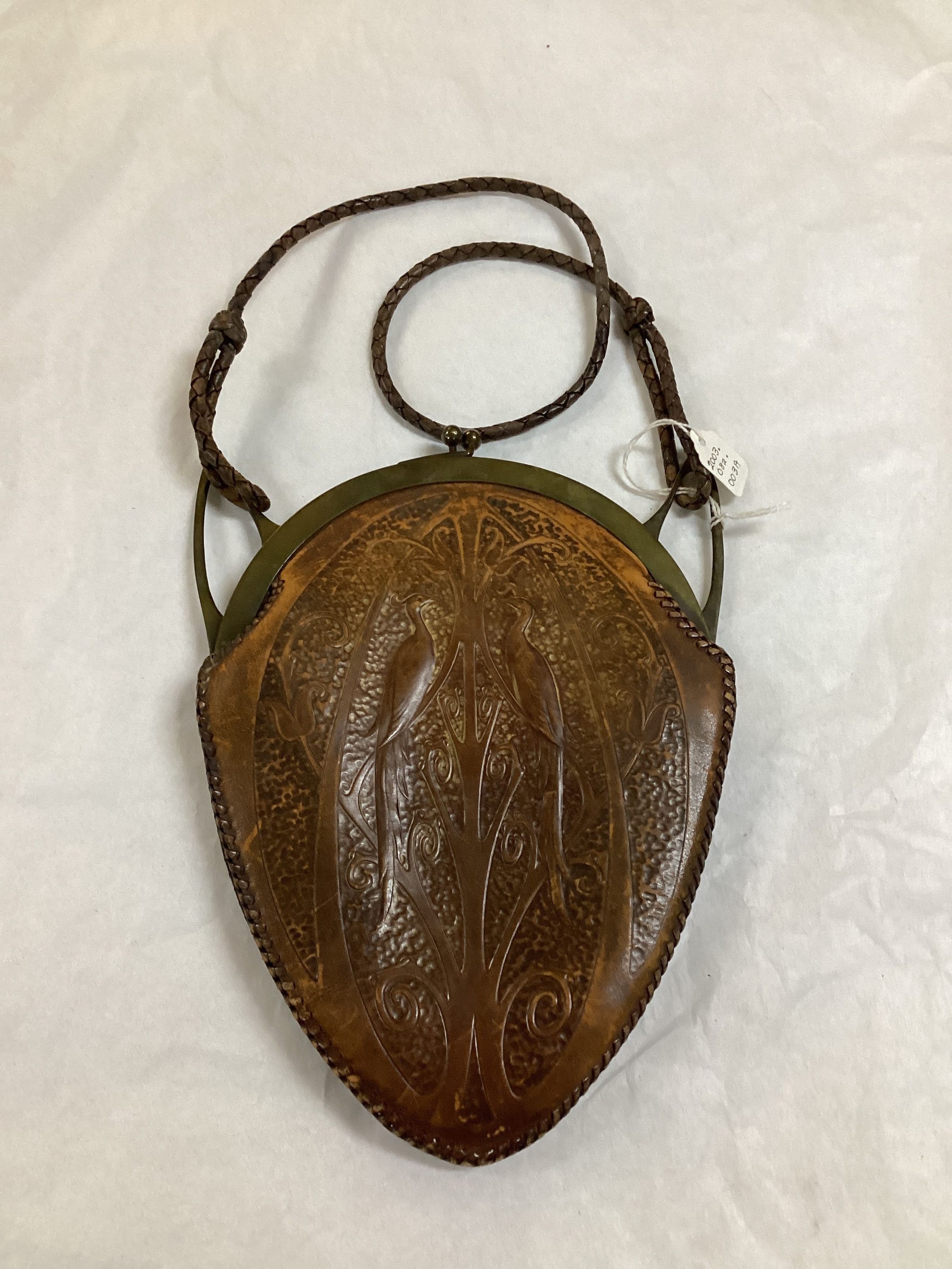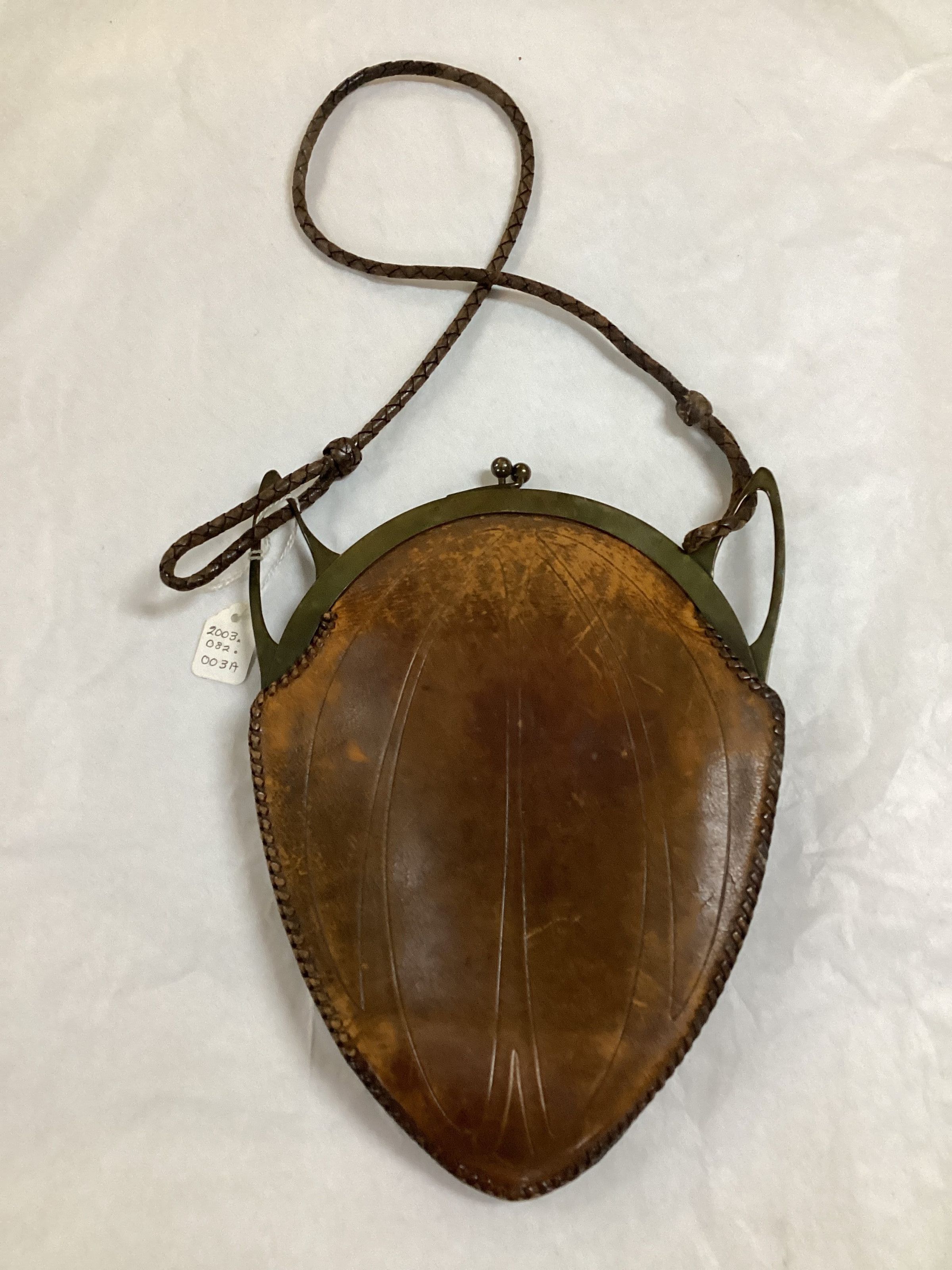 A purse with a pointed bottom and urn-shaped handles, made of brown leather and brass. Across the leather surface of the purse is an Art Nouveau image of two birds. The name "MATTIE OWEN VALENTINE" embossed on interior. Contains a "Pullman" ticket dated Feb. 26, 1927. Front also has gold color incorporated in background.Collection