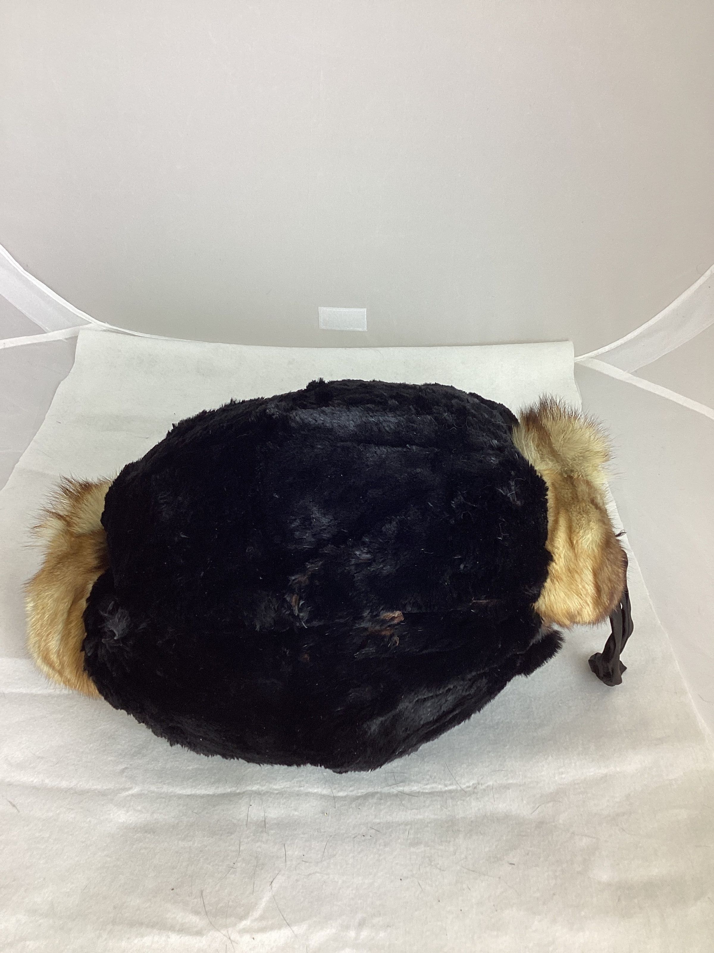 Seal skin muff banded with fox; lining black silk; silk hook to go over hand.Collection