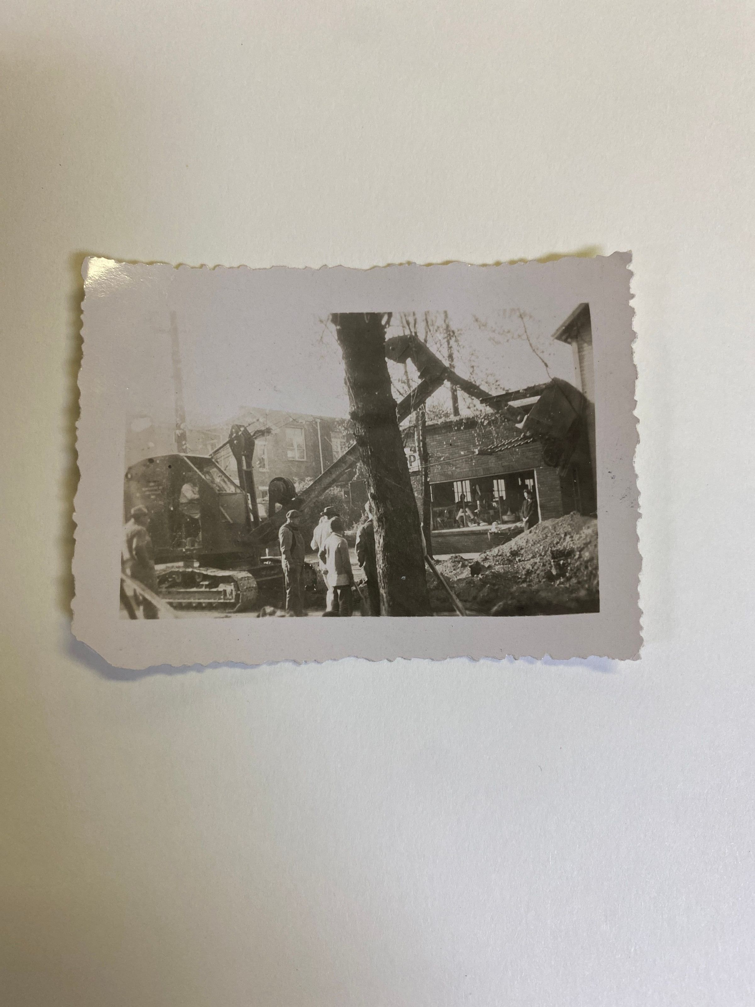 Black and white glossy photographic snapshot in landscapte format. Nothing noted on back. Image is of an excavator digging into the ground in front of a brick building.Photograph Details