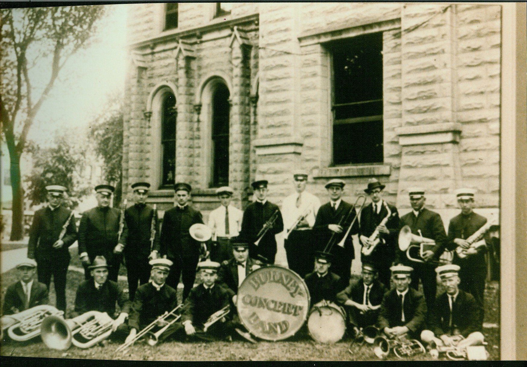 Sepia glossy photographic print in landscape format. This is a copy of an older photograph dated approximately 1923. Image is of a band posed in front of a corner of the Greensburg, Indiana courthouse. "Burney Concert Band" on the bass drum. Written on back: "#6-Burney Band taken at Greensburg Court House/about 1923/Standing-Fred Rasp 2nd from left/Walter Rasp 3rd from left/M. J. Hill behind drum." Donation, 09/1992.Collection