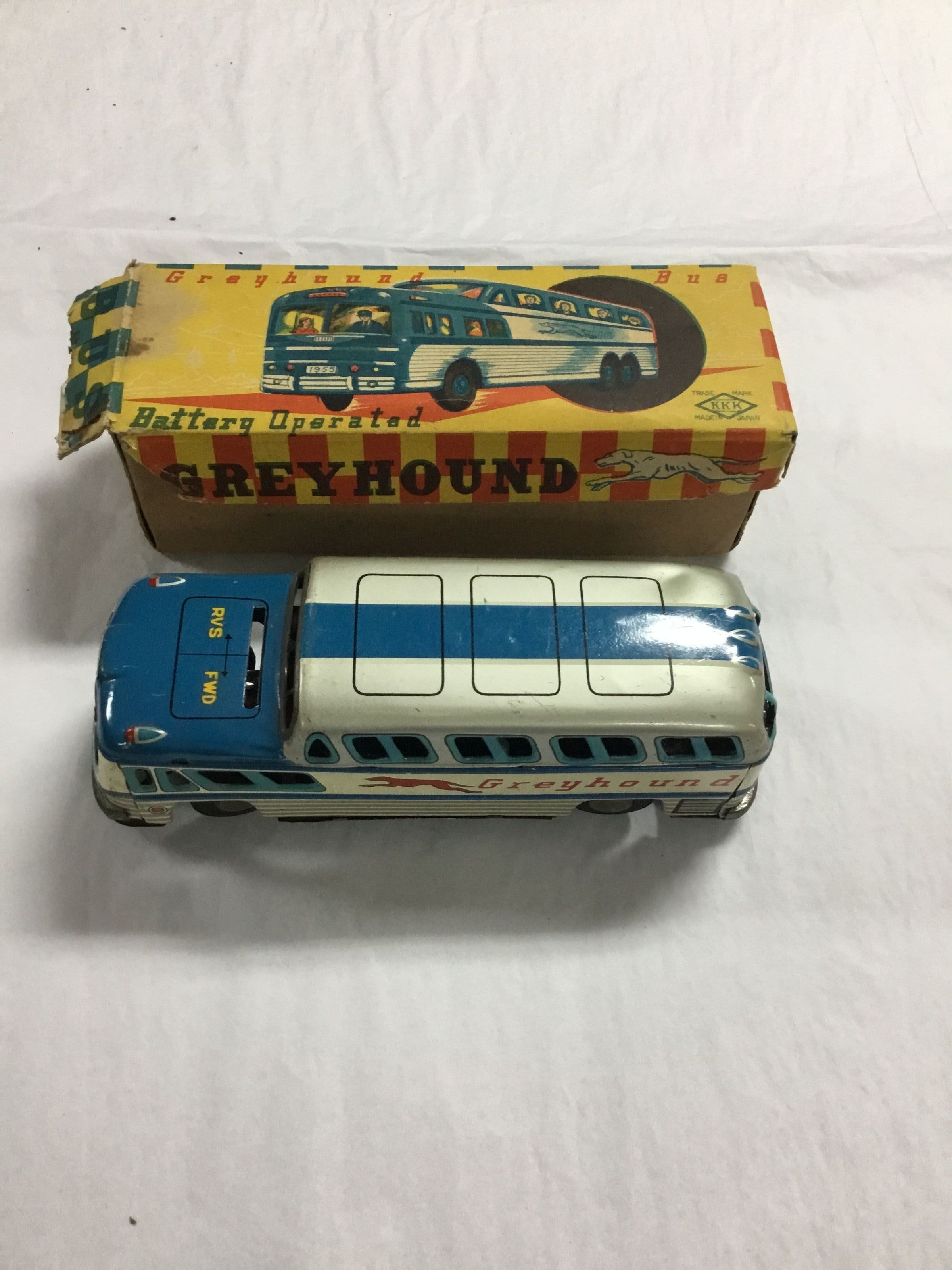 Toy "Grayhound" model passenger bus; battery operated with four rubber tires painted blue and gray with symbol of "Grayhound" on each side. Windows outlined in light blue with a cream colored stripe all around the middle of the bus. Over the front windows is the sign "Express" and all lights are painted on. Bumper on back and front; blue and white stripe on top and over front passenger area is slot for forward and reverse switch. Probably Post WW11 production to help Japanese economy . In original box marker 1983.030.021ACollection