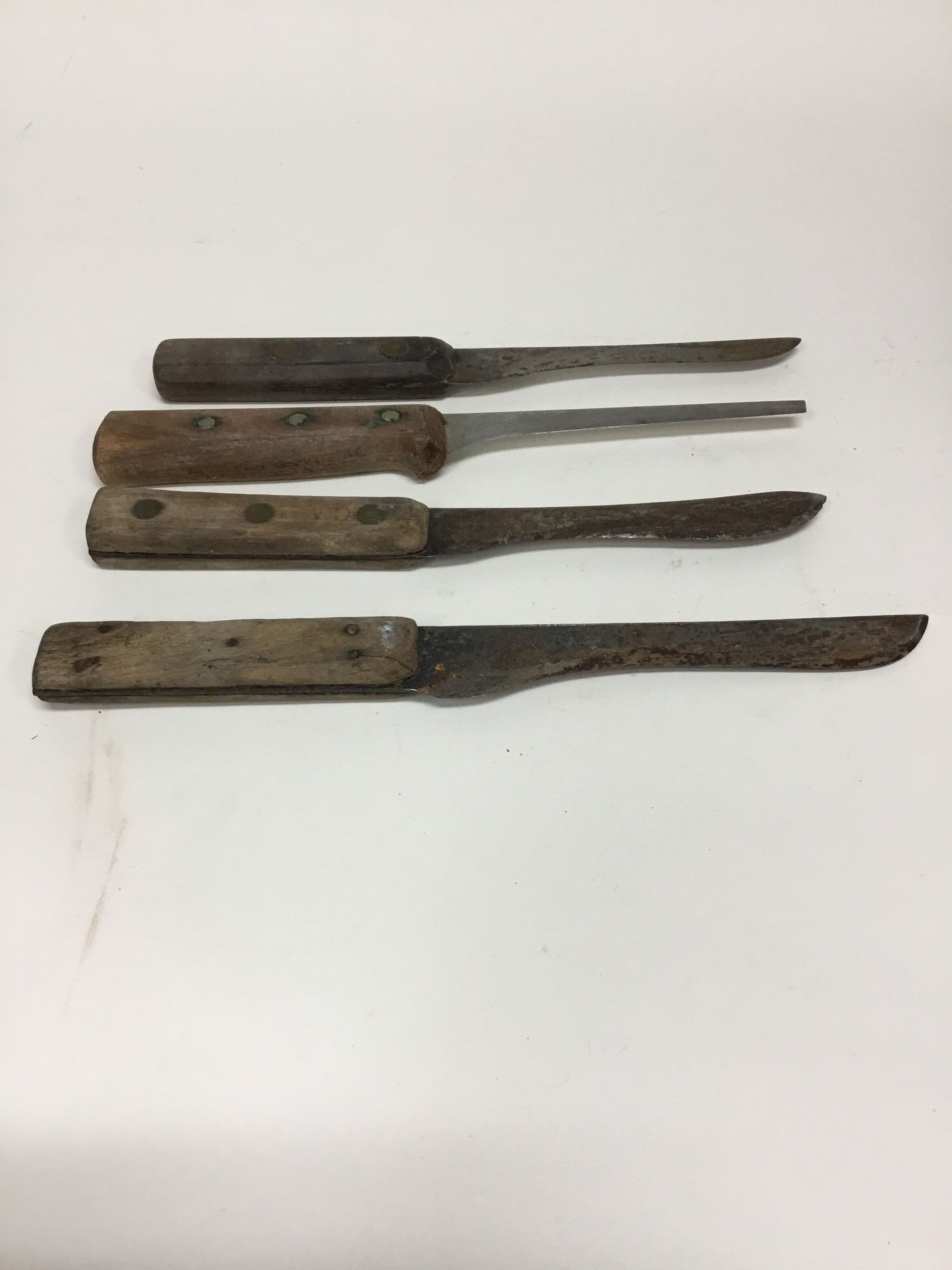 C.Knife with narrow blade coming to a flat end. Wooden handle.