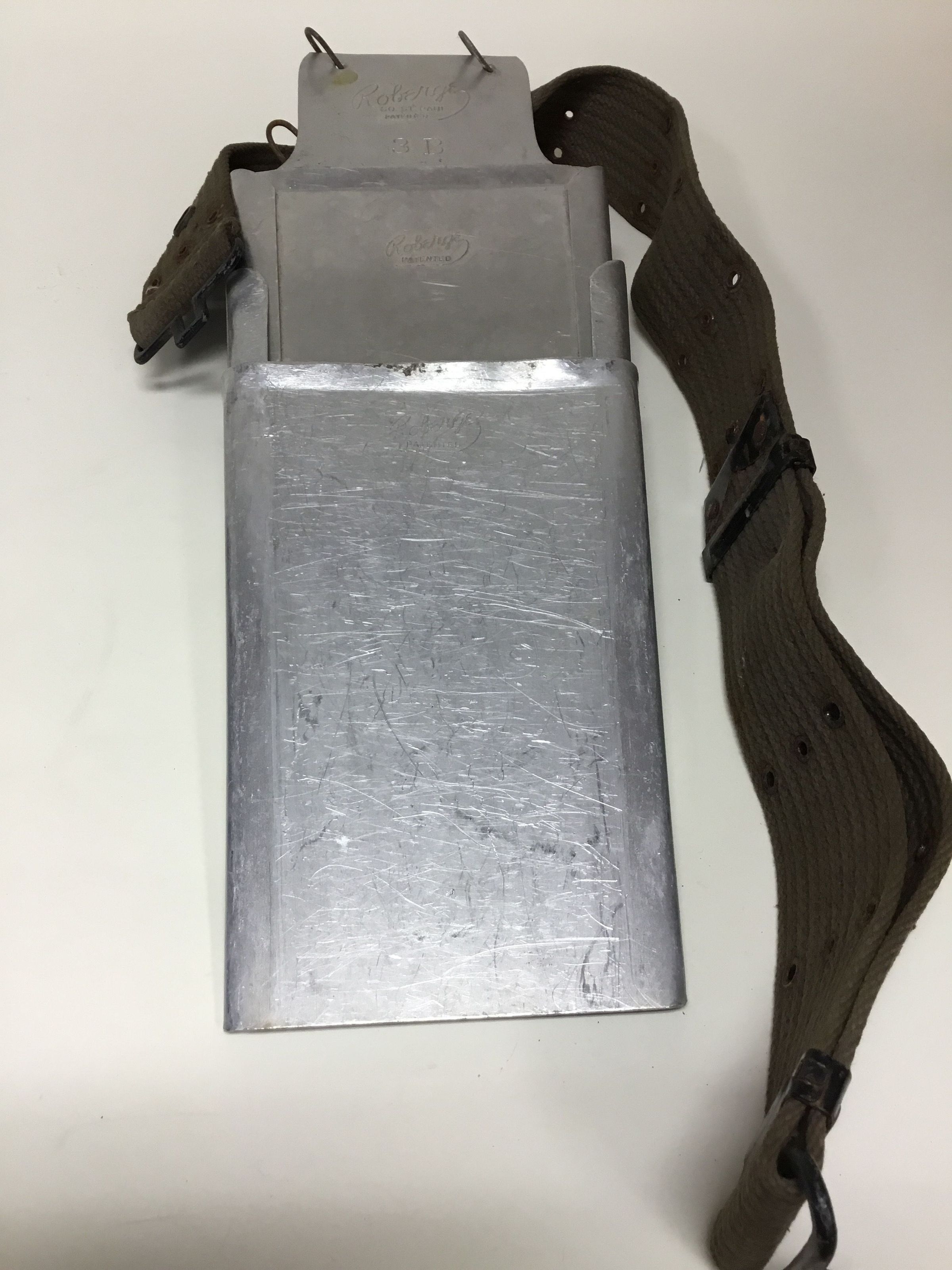 A. Gray metal holder for knives with upper slot and 4” down, another slot, which is very narrow. Canvas strap with rivets and buckle.