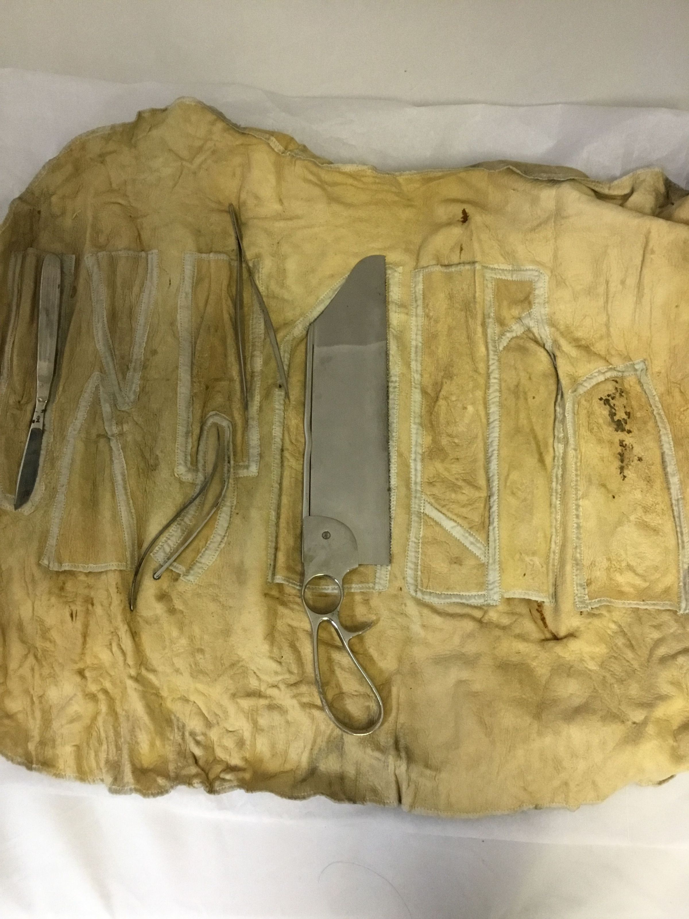 Beige calfskin holder for surgical tools, having individual pockets. 4 instruments are present: forceps, 2 probes and a wide blade knife.Collection