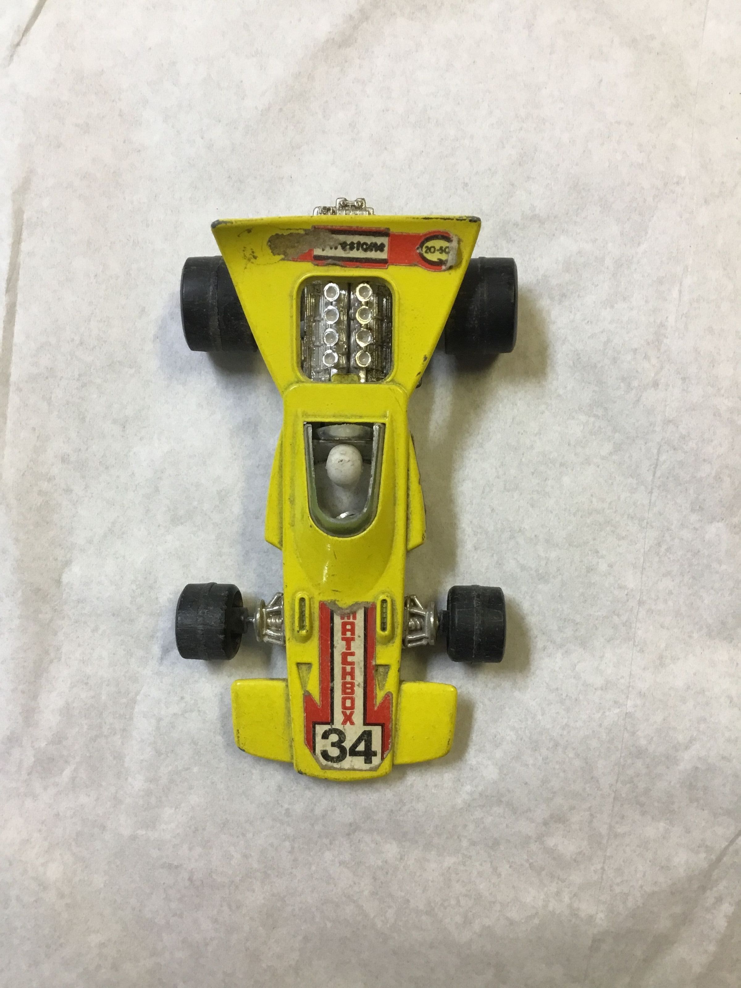Toy race car; has metal frame body is yellow plastic and 1 4 black hard plastic tires; there is whitel plastic molded figure in driver's cocpit and behind driver is silver colored molded plastic 8 cylinder engine; decals on side and front of car denote it as "Matchbox 34'; there is a partial "Firestone' decal on the spoiler; underside of spoiler is embossed "THUNDER CLAP"