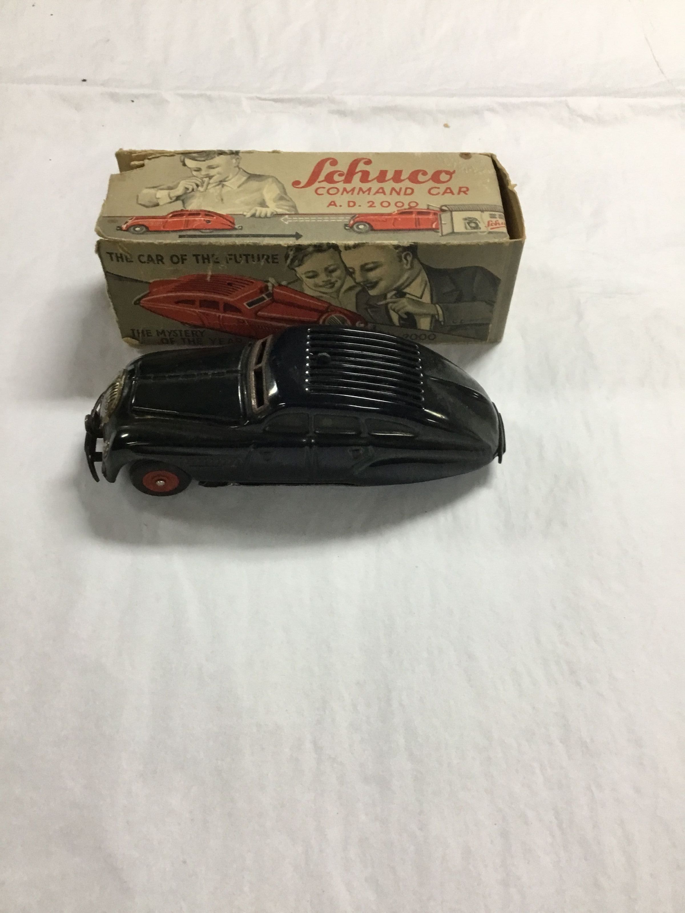 A black metal for door sedan - wind - toy; grilled top small wind-shield-fin back. Licsense plat on back Schuco Front AD 200 Also Schuco on brassy looking grill of radiator. Wheels have red centers; hood opens on both sides. On bottom of car in white lettering Schuco-Kommando Anno 200 D.R. Patente D,R,G,M, Patents App for in England USA Italy, Schwerz - Japan - Brevete France SGDG Importi Dallemange - Made in Germany. Post WW II production to get German economy on feet. Original bos sbunumbered 1983.030.018 A Wind up key is 1983 030.018C.Collection