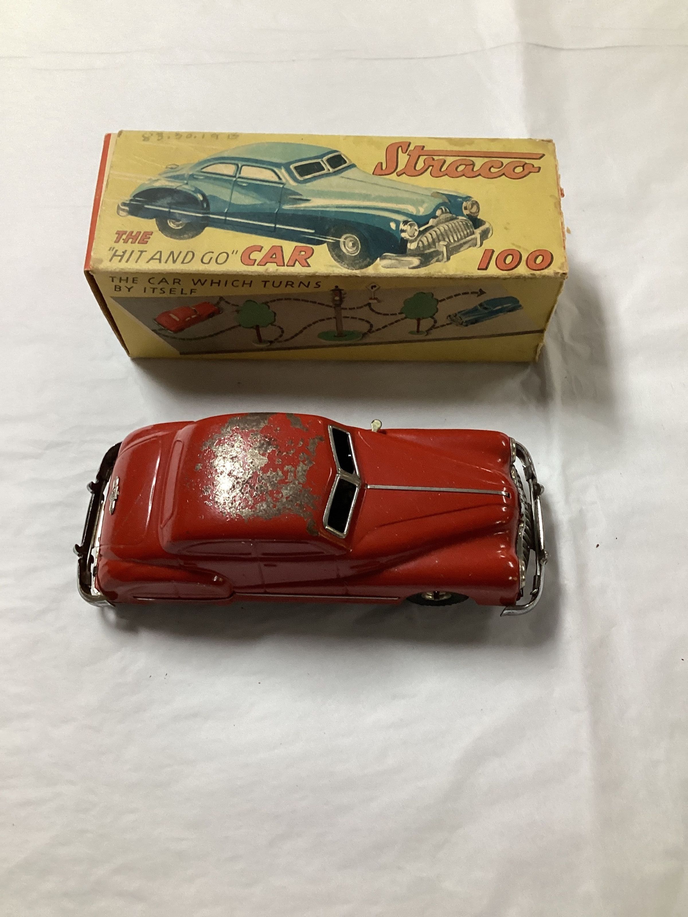 Red metal car black tires-silver metal bumpers-windshield-grill headlights and trunk emblem. Four door sedan. Post WW II production to get German economy on feet . In original box subnumbered 1983.030.019A, instruction sheet subnumbered 1983.030.019B.Collection