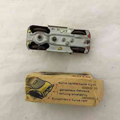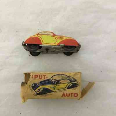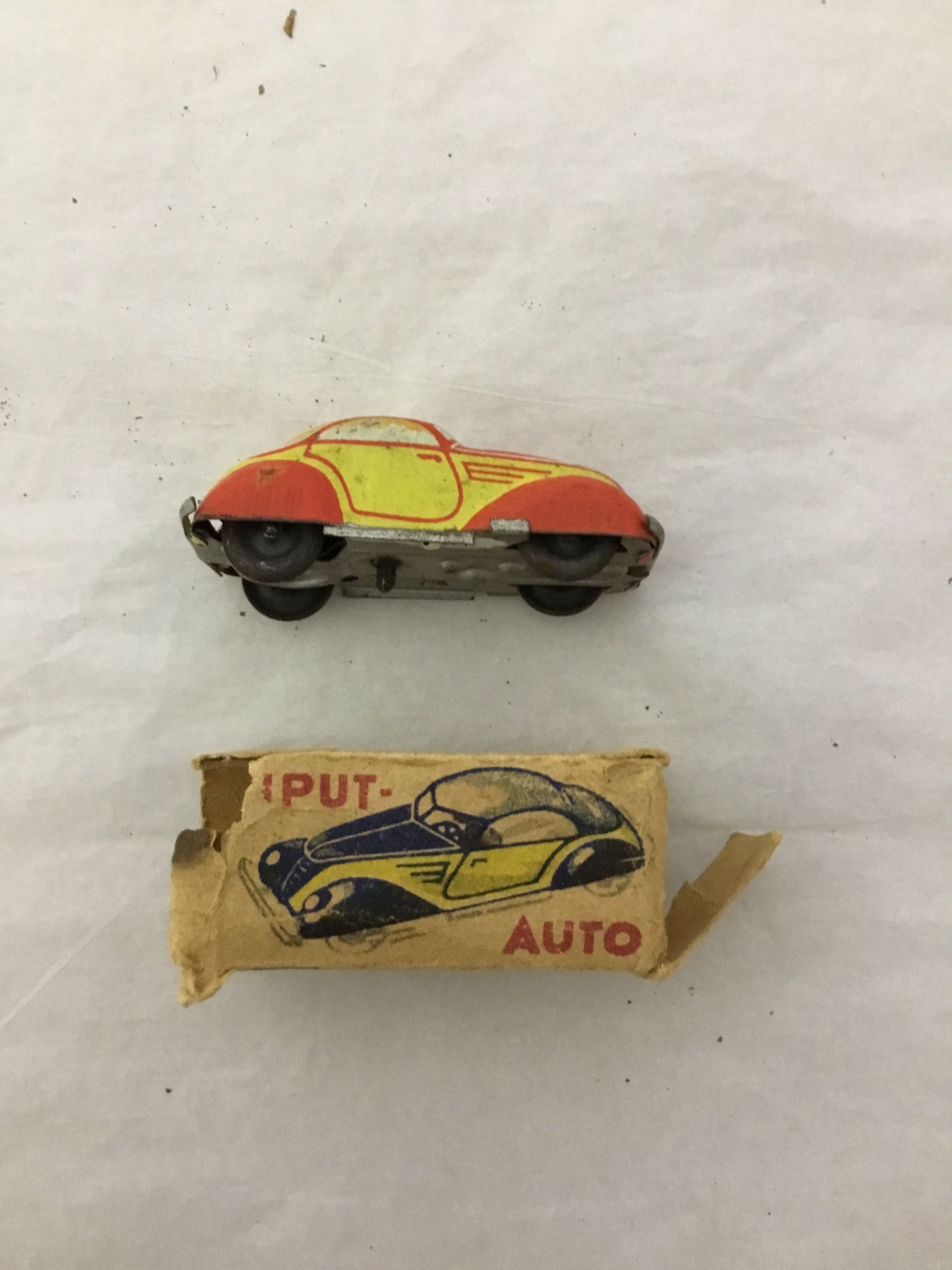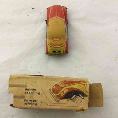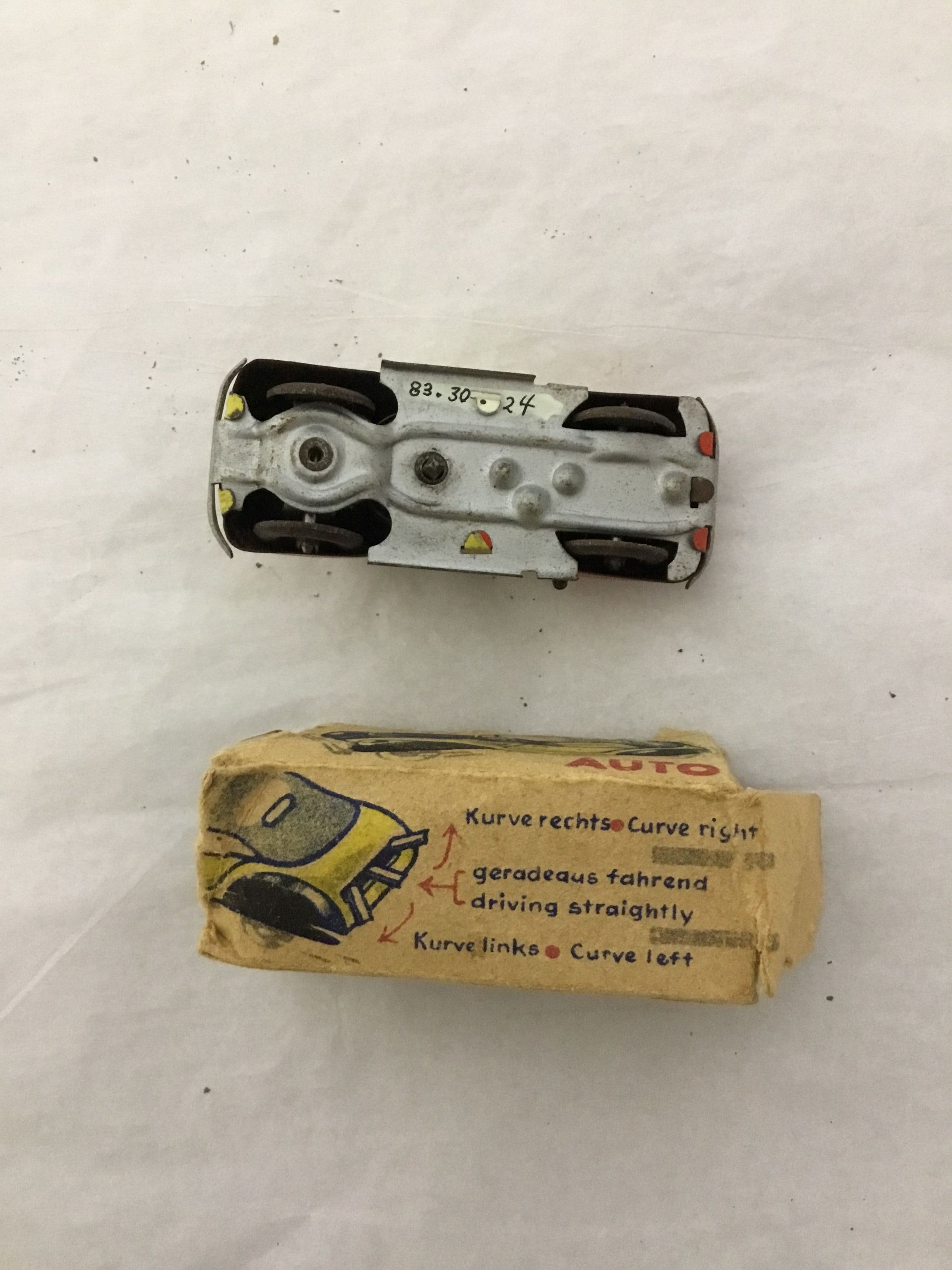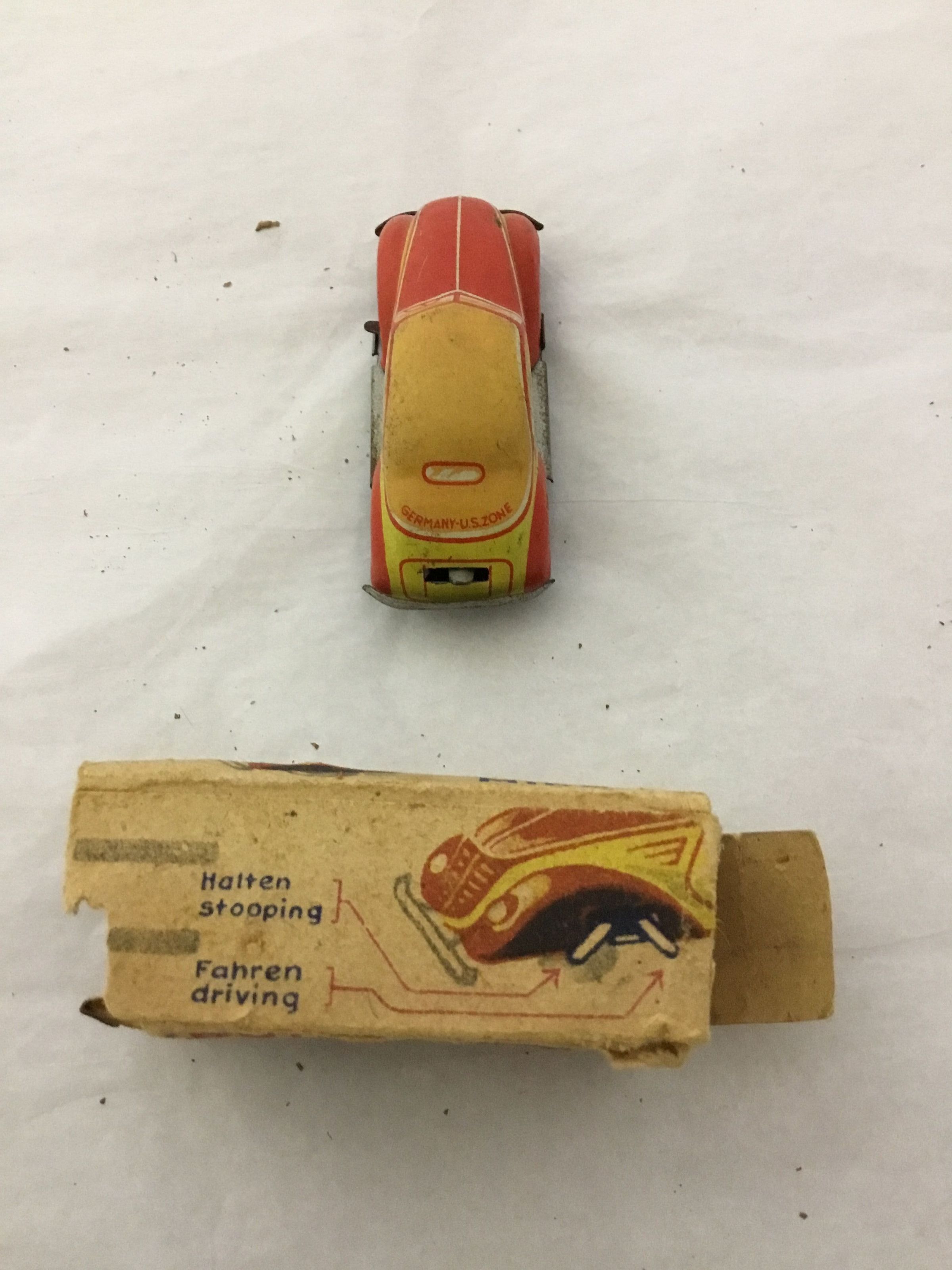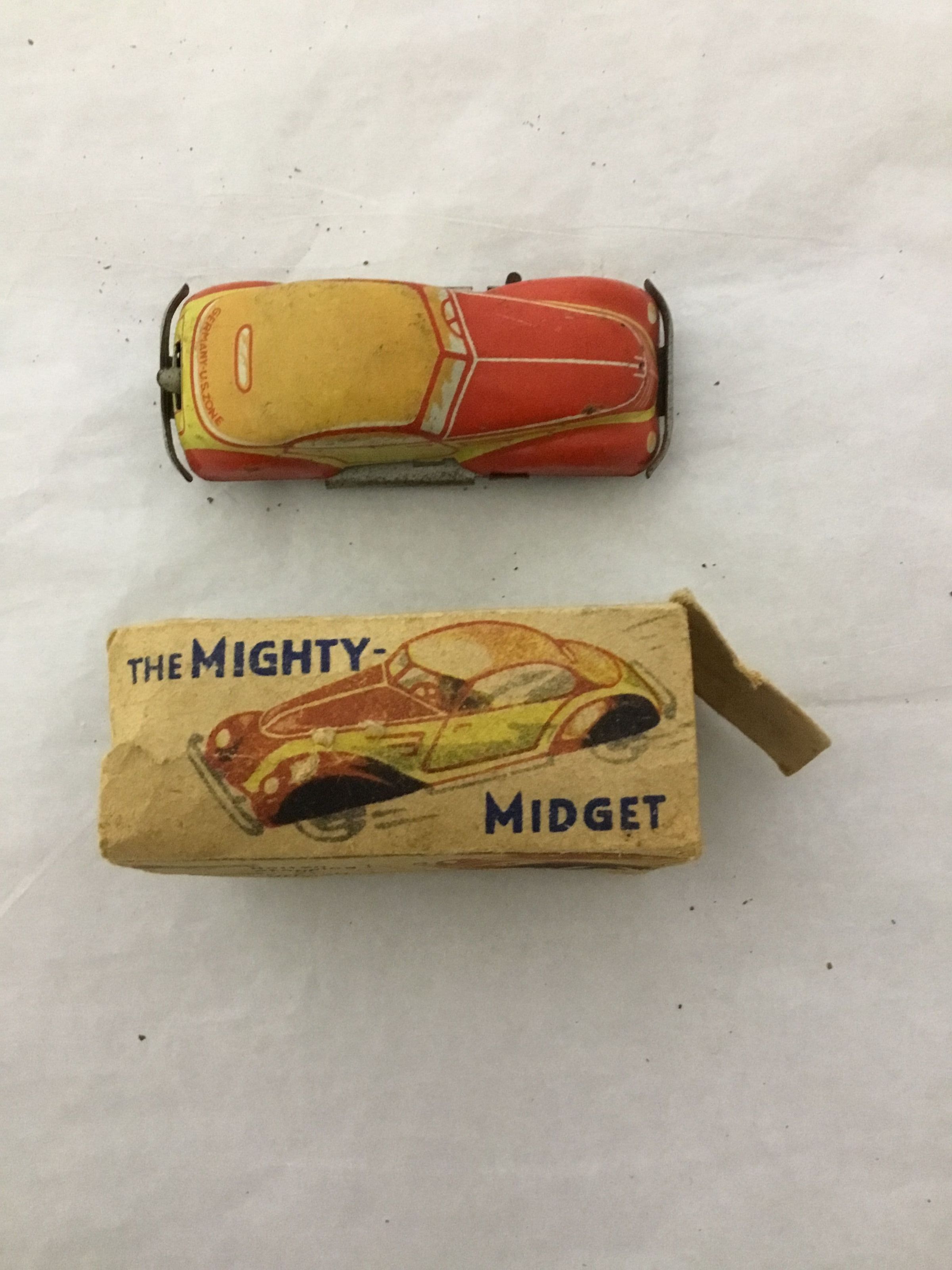 Miniature toy car; features painted on in red and yellow. Silver-gray underbody; had wind-up key on bottom; small metal brown painted wheels, control lever on back. Stamped metal toy car in red yellow and orange; all features are lithographed or painted; has cloce work motor that winds from underside; a switch behind left front tire and another switch located in trunk area. "Germany - US Zone" Printed on rear of toy. Box labels car as "The Mighty Midget: probably post WW11 production to get GHerman economy on feet. Bos is 1983.030.024 A and wind up key is 1983.030.024BCollection