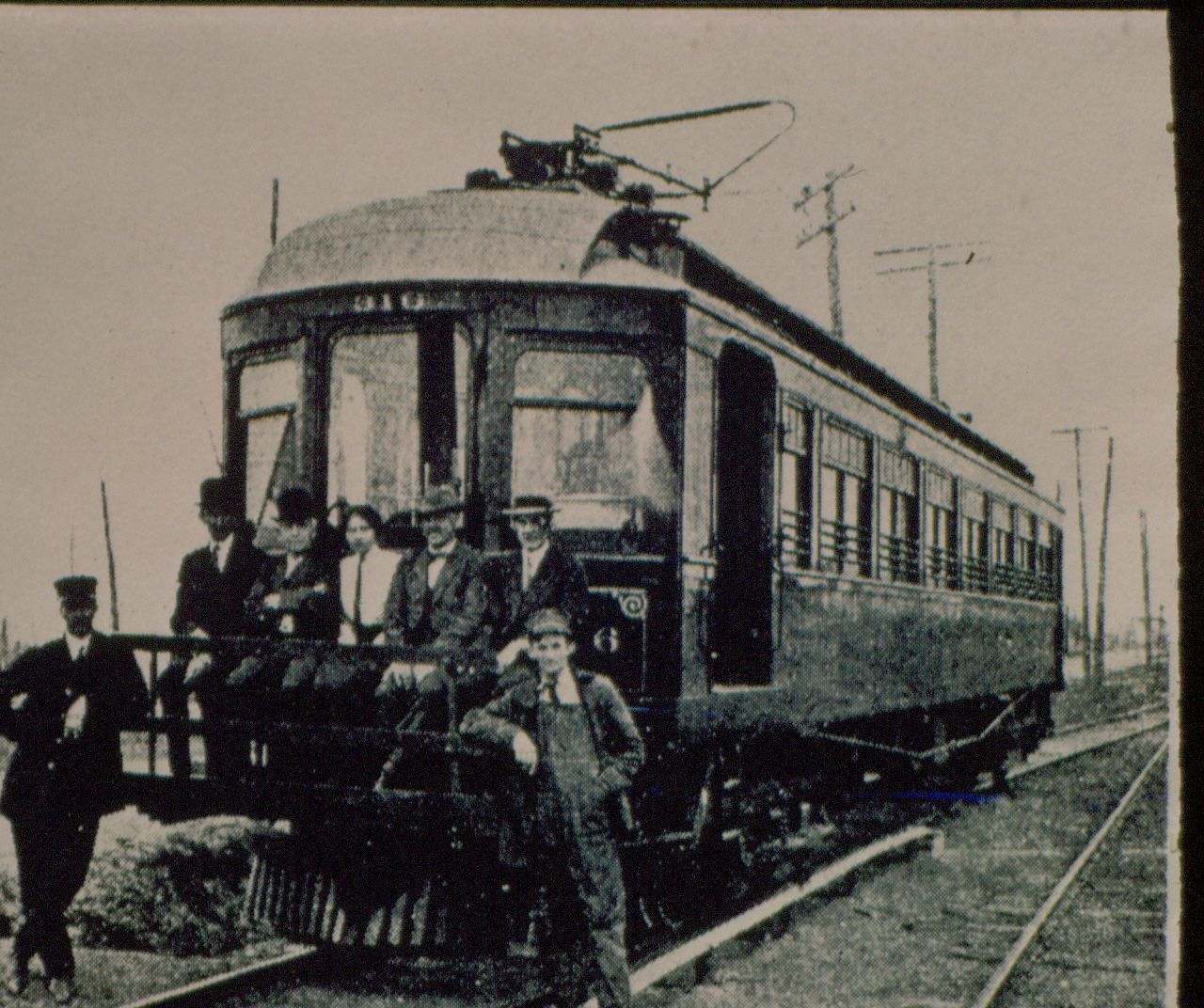 Black & white; Copystand of dot printed image; shows interurban car; front collector up and the number "316" appears above motorman's center window; horizontal bars at bottom of passenger windows; platform extends above cow catcher, has 5 men seated on it, man standing on each end of platform has an arm resting against it; car parked on a siding, line of utility poles in background.