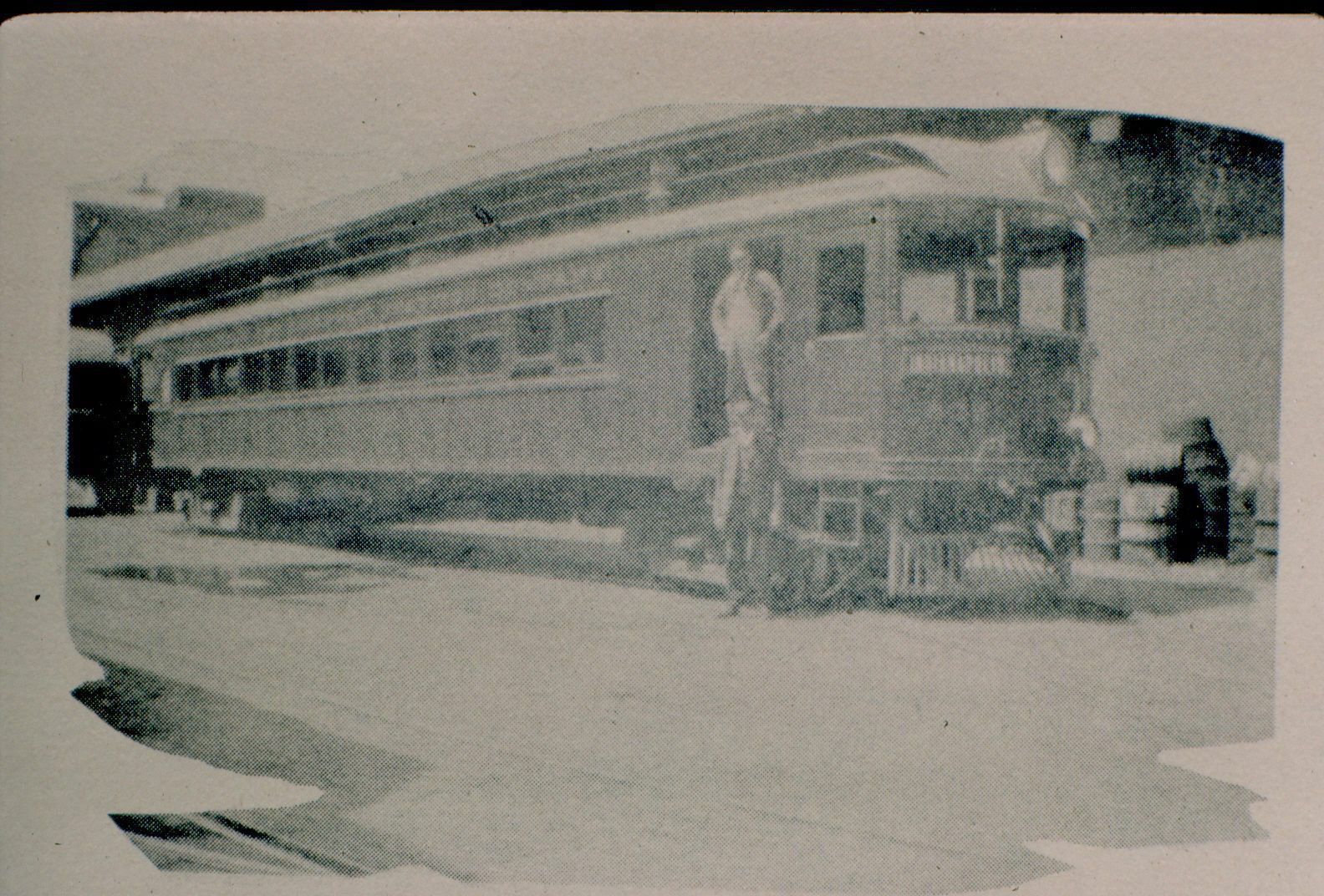 Black & white; Copystand of dot printed image; shows interurban car; 2 headlamps, round one below motorman's center window, other one above center window inside a dome housing; conductor standing on ground front of car, motorman standing in open doorway; steel drums behind car against a wall.