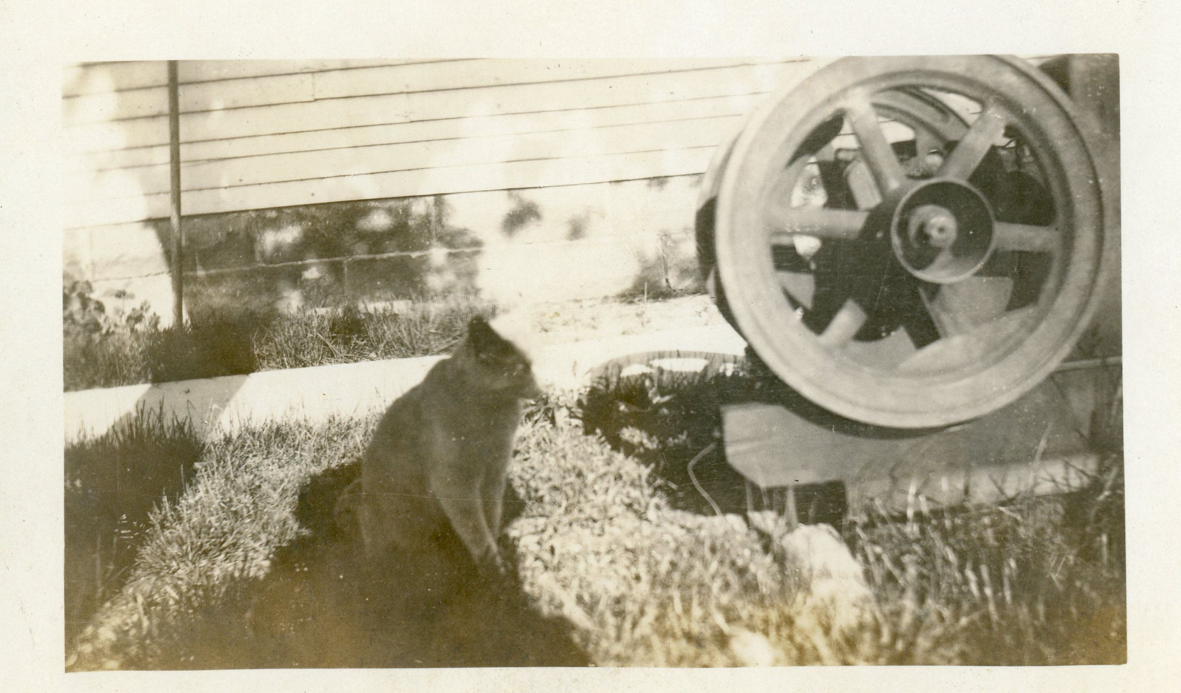 A sepia-toned snapshot of a cat sitting on a grass lawn at the side of a house. To the right of the cat is some sort of metal wheel.Photograph Details