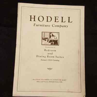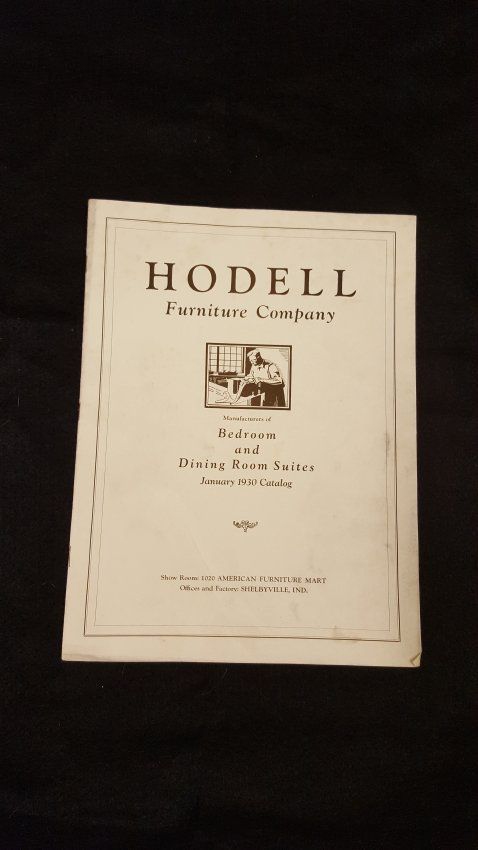 Catalog published by Hedell Furniture Co in January 1930. Has dark brown writing and design on the cover page including a thin line border. The title reads, "HODELL Furniture Company." Underneath there is a small illustration of a man wood working. Then underneath the illustration it says, "Manufacturers of Bedroom and Dining Room Suites- January 1930 Catalog." Then below that it says, "Show Room: 1020 AMERICAN FURNITURE MART," then, "Offices and Factory: SHELBYVILLE, IN." Inside content includes photo of different types of wooden furniture created by the company. Each page has a small box in the corner of the page to describe the types of furniture (what kind of wood, what style, size etc.) Back Cover says, "The Hodell Furniture Company," next line, "Shelbyville, Indiana"