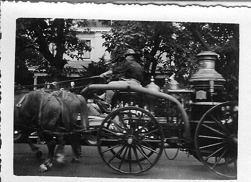 Black and white snapshot; subject is piece of horse drawn fire fighting equipment; rear of horse team just visible on left side of print; drive sits on a high seat; and behind him is a boiler apparatus; large hose visible on side that wraps around in front of the driver; part of a house and 1950's car visible in background; edges have been trimmed so they have an irregular surface.