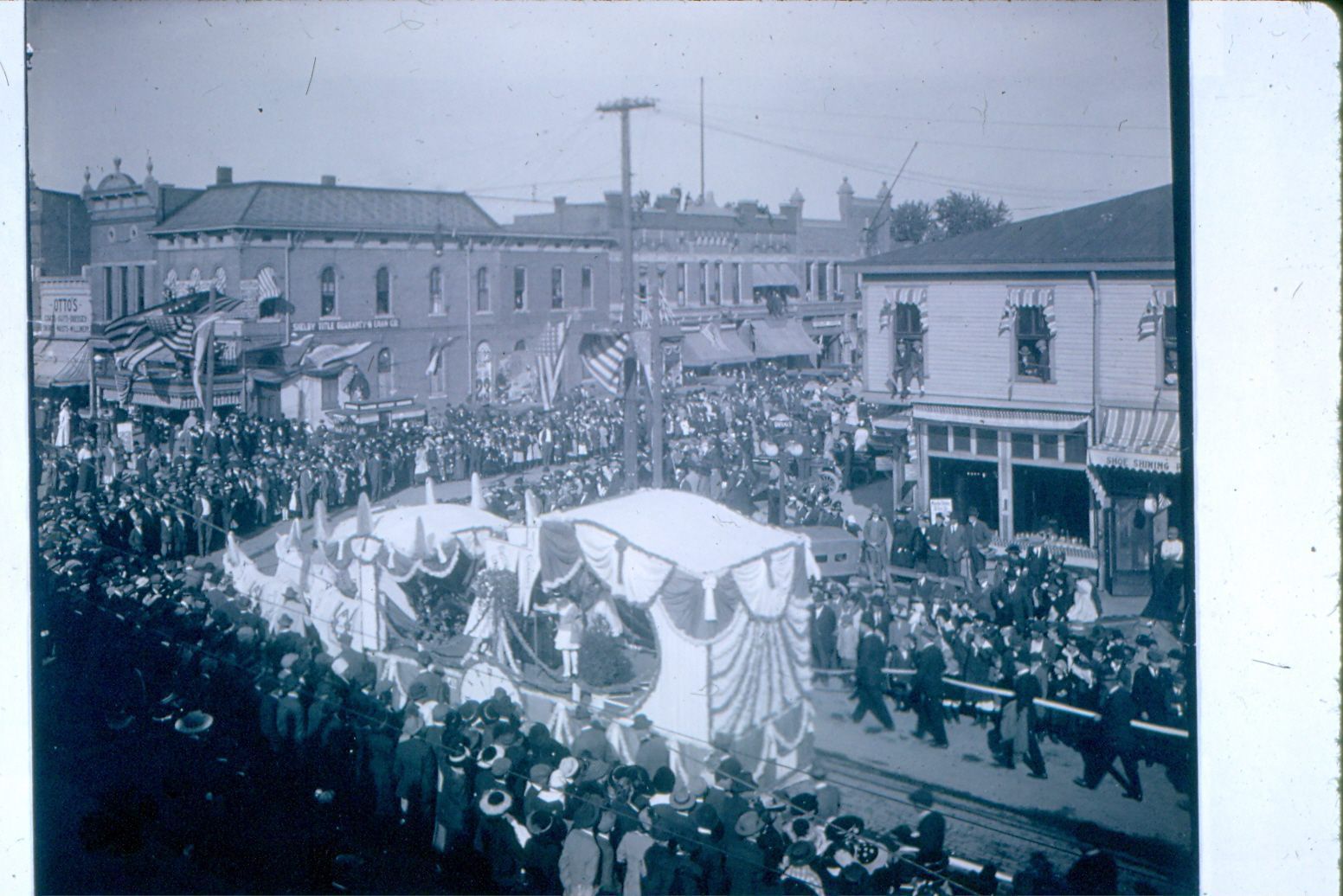 Donation, 07/26/2005. Black and white photographic slide in landscape format. Slide frame is marked: "Broadway & Harrison N. E. Corn./1916 Centennial Parade."Collection