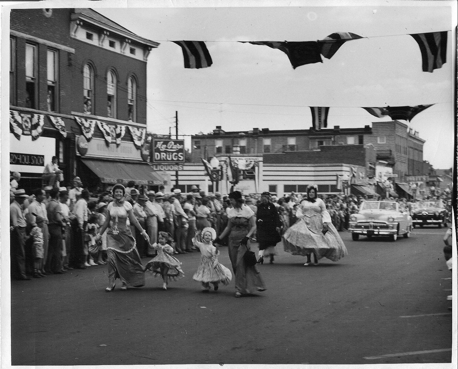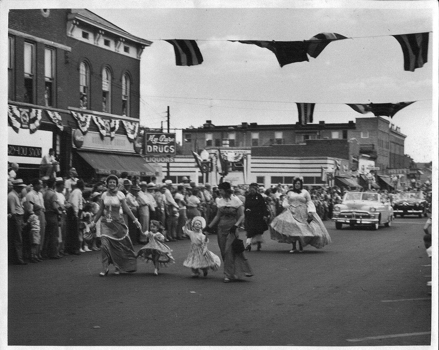 Black and white photographic print in landscape format of the Centennial Parade, 1950, intersection S. Harrison St. with banners flying. Worland Drugs, northeast corner of S. Harrison St. Two copies of the same photo. A: matte B: glossy. Donation, 12/1990, by Lindsay Howell.Collection