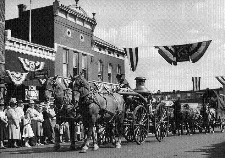 Black and white photographic print in landscape format. Centennial Parade, 1950, Shelbyville, IN. Image is of a horse-drawn fire engine. Donation, 12/1990. Used by Foster James Howell.Collection