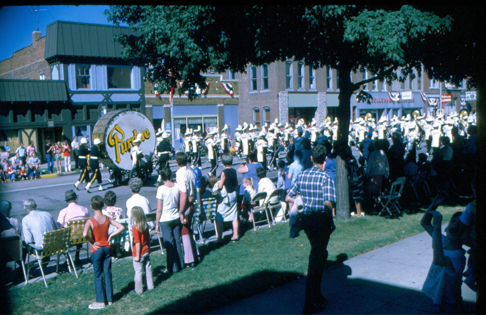 Donation, 07/26/2005. Color photographic slide in landscape format. Slide frame is marked: "Cent. Parade." Image is of the Purdue Marching Band on West Broadway.Collection