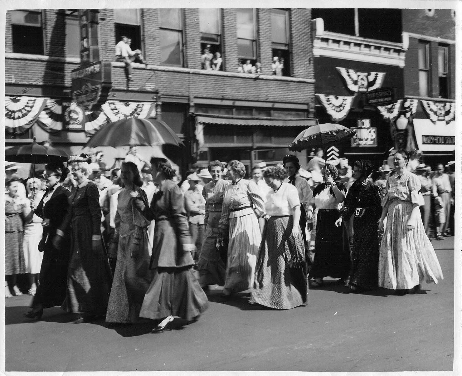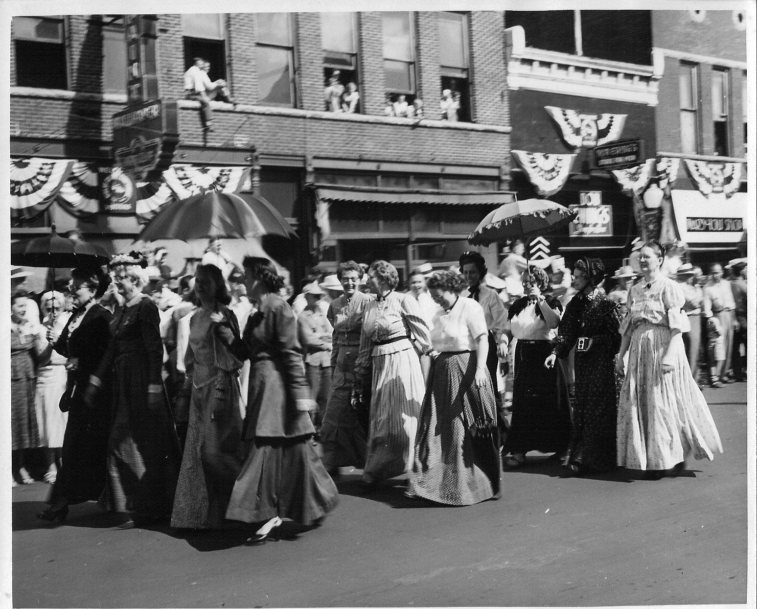 A and B: Two identical black and white glossy photographic print in landscape format. Centennial Parade, 1950, Shelbyville, IN. Image is of a group of pioneer women. Donation, 12/1990. Used by Foster James Howell.Collection