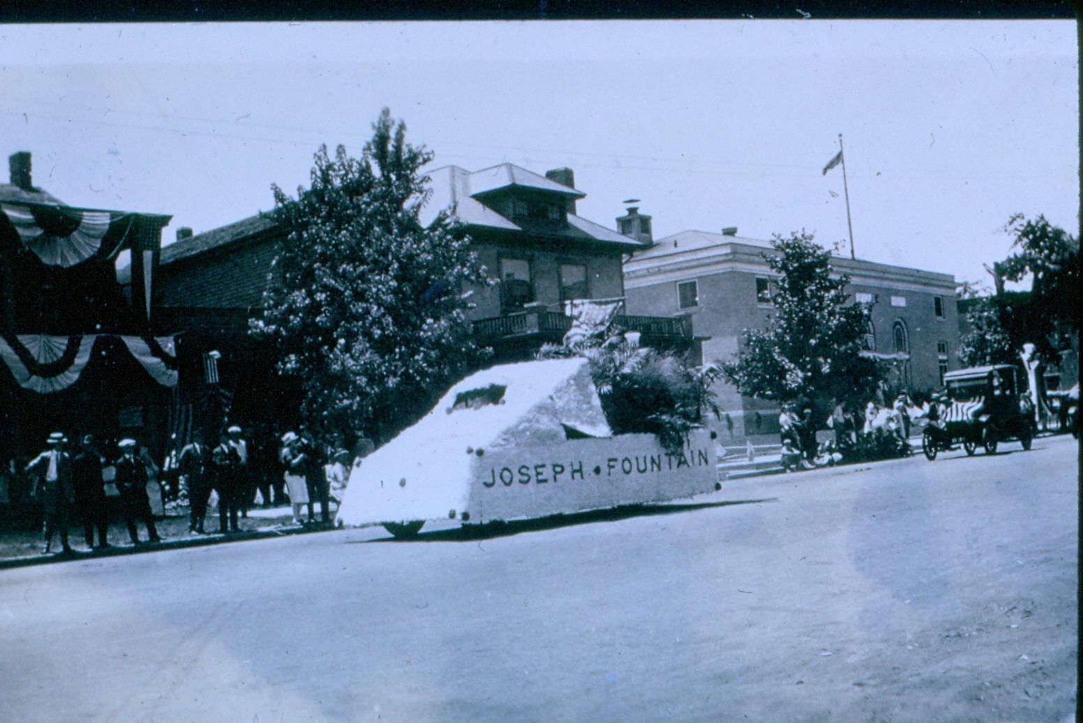Donation, 07/26/2005. Black and white photographic slide in landscape format. Shelby County Centennial Parade on East Washington Street. Joseph Fountain on the side of the float and 1922.Collection
