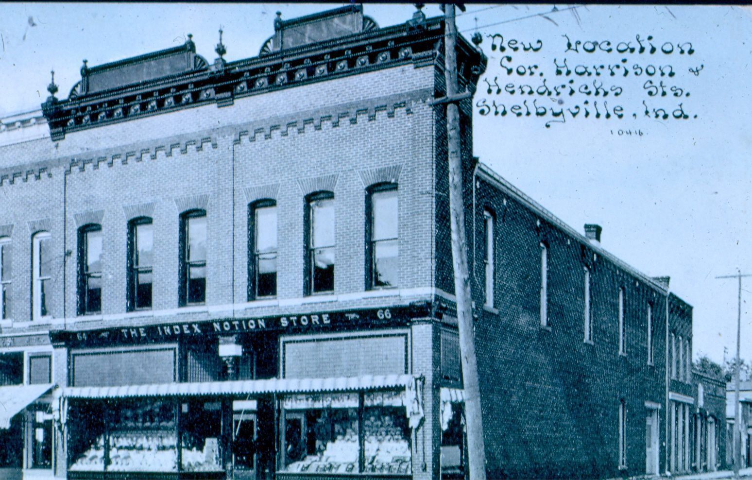 Donation, 07/26/2005. Black and white photographic slide in landscape format. Slide frame is marked: "S. Harrison/Index Store" Printed on image: "New location/Cor. Harrison &/Hendricks Sts./Shelbyville, Ind." On the store front: "The Index Notion Store."Collection