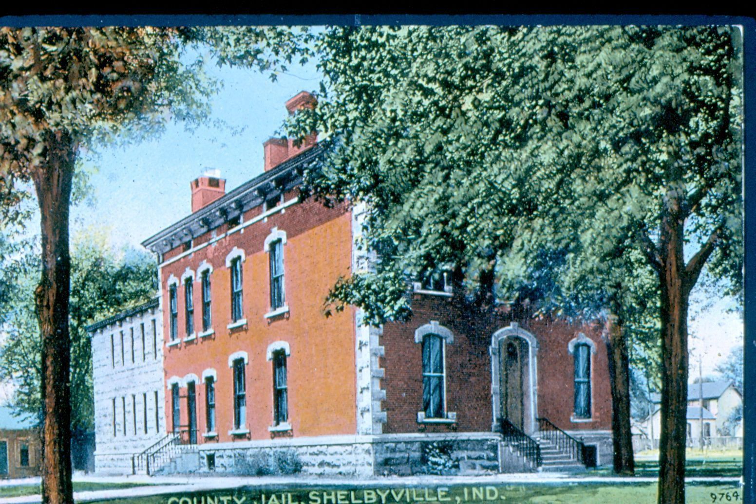 Donation, 07/26/2005. Color photographic slide in landscape format. Slide frame is marked: "Jail." In white at bottom edge of image: "County Jail, Shelbyville, Ind." Image is of a two-story brick building with a bedford stone foundation.Collection