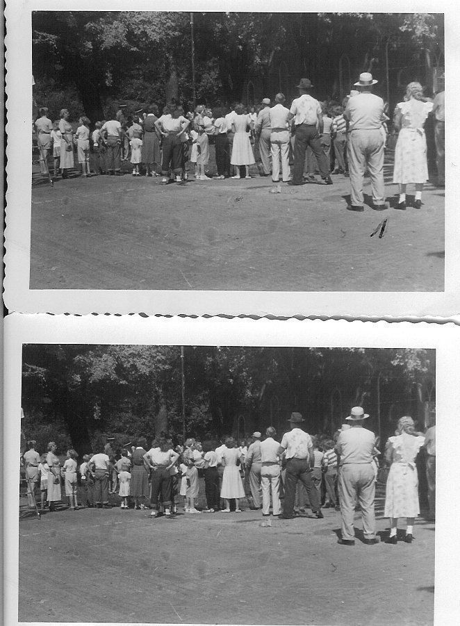 B&W photo; large crowd of people standing in a line ; church in background; Mark appears on 1983.053.098A only; B has tabCollection