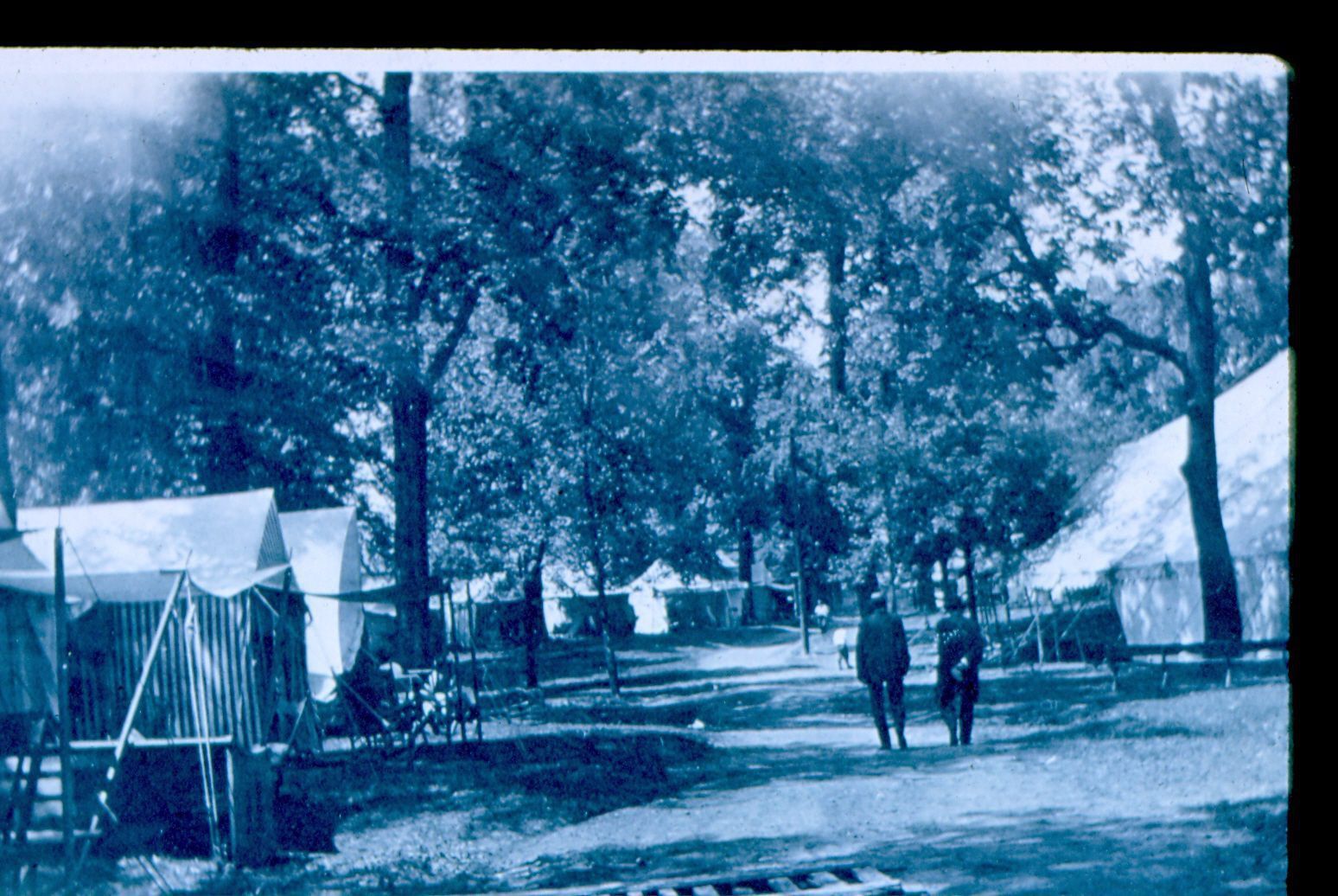 Image is of white tents among trees, two men walking.Collection