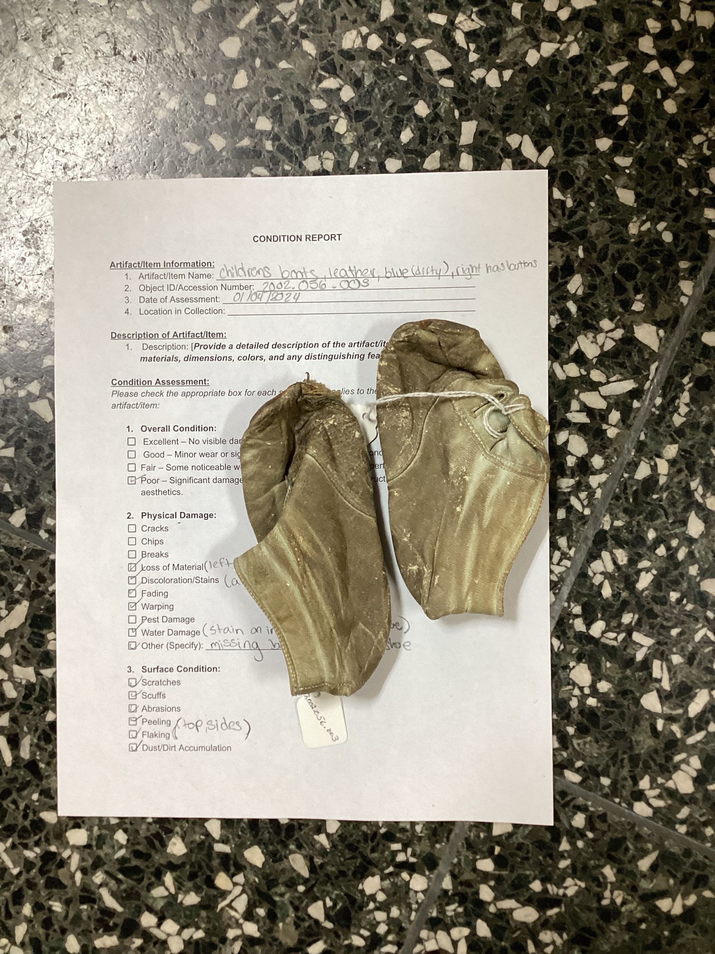 Blue leather baby shoes. One w/ 3 white buttons, one missing. One missing all four buttons. One w/ hole worn in toe.Collection