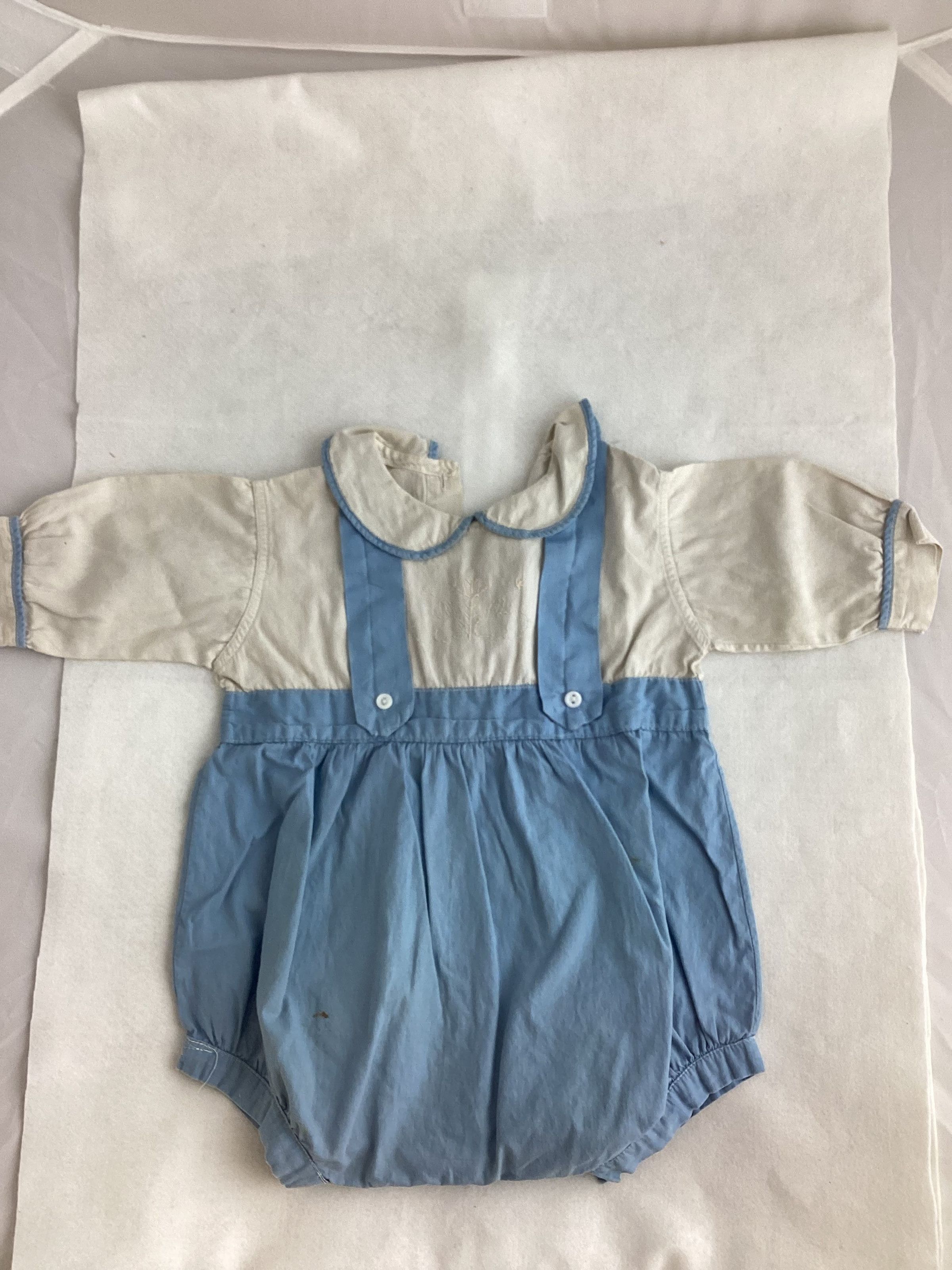 Boy's romper. White top w/ rabbit embroidery, straps w/ buttons, Peter Pan collar trimmed in blue, blue bottom, 2 buttons at back.Collection