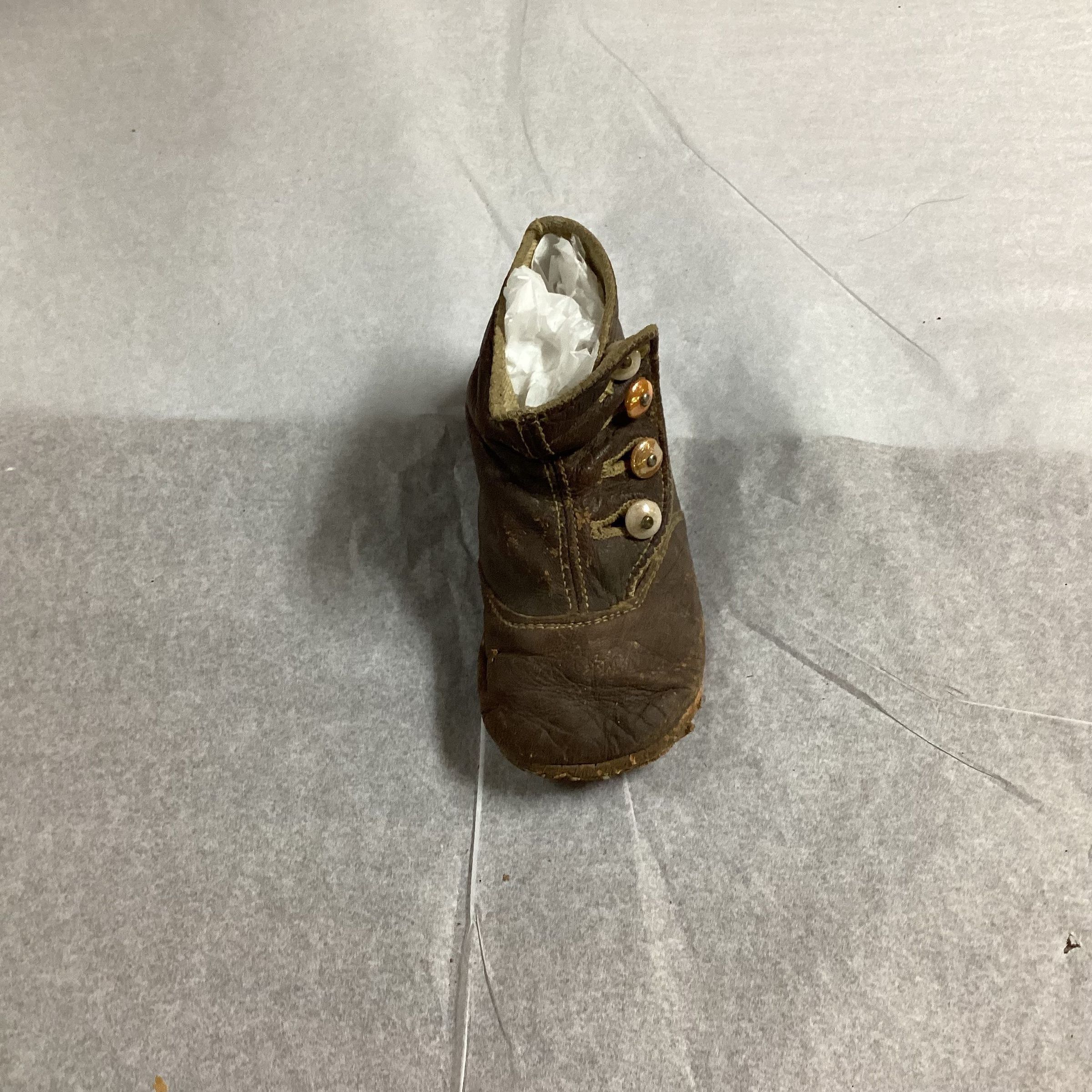 A single children's brown leather bootie with pearlescent glass buttons.Clothing/Dress/Costume Details