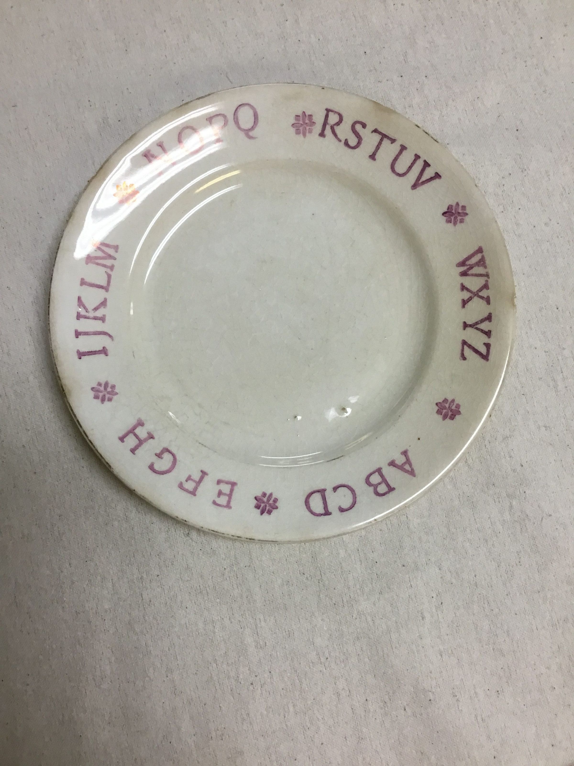 Child size plate in white; has remnants of a gold band around outer eg\dge; rim is decorated with sort of red or purple color transfer of the alphabet in upper case; the letters are divided into grouping with a 'snowflake' pattern between groupings