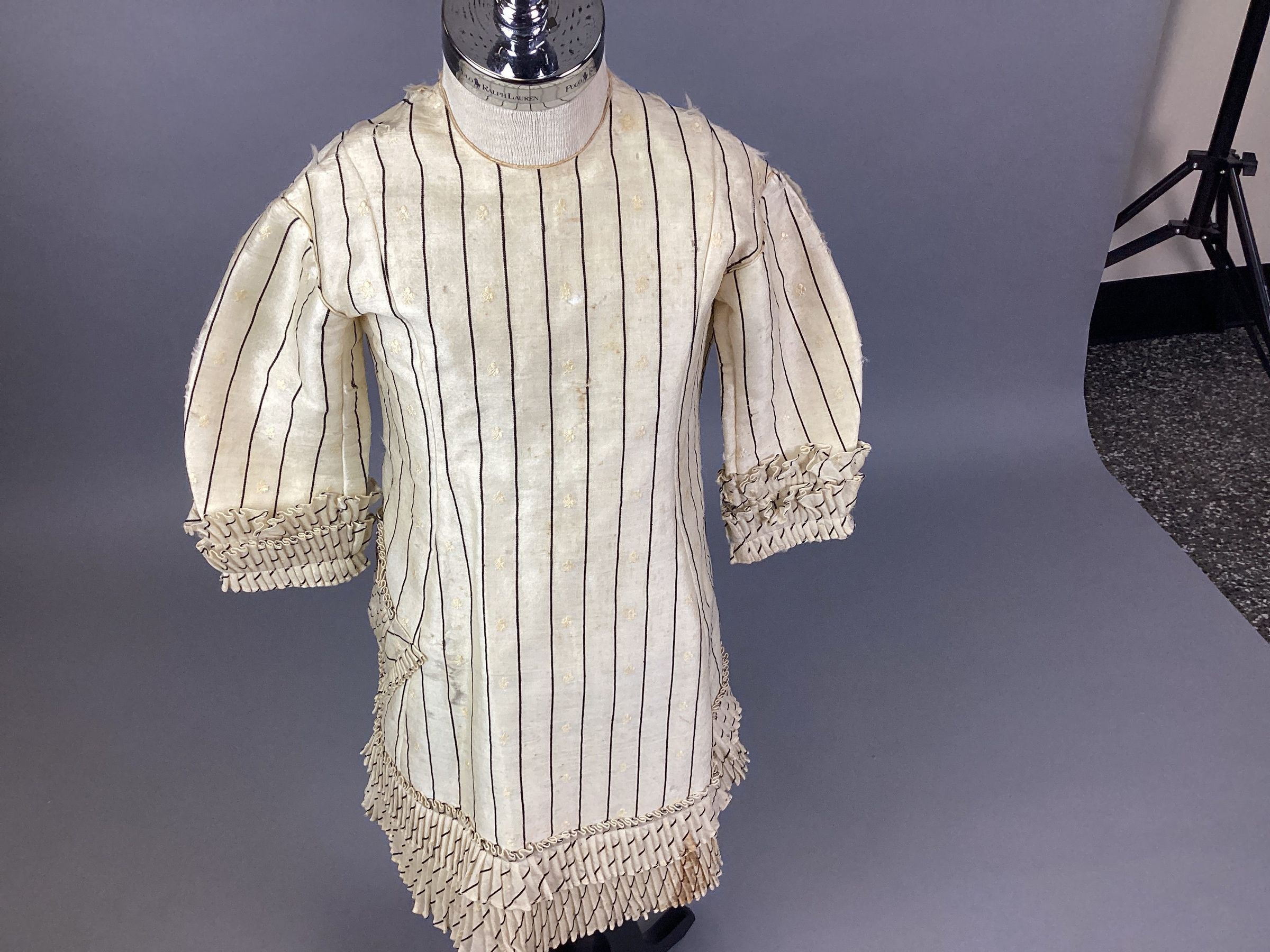 Child's princess-style dress; fastens in back with 9 white buttons; sleeves and hem trimmed with 2 pleated ruffles of self material; there is one pocket which is also pleated; material is white taffetta with black stripe, every other white stripe has small white embroidered flowers; has a high round neck; arm holes and neck finished with self cording; entire dress lined with white cambric.