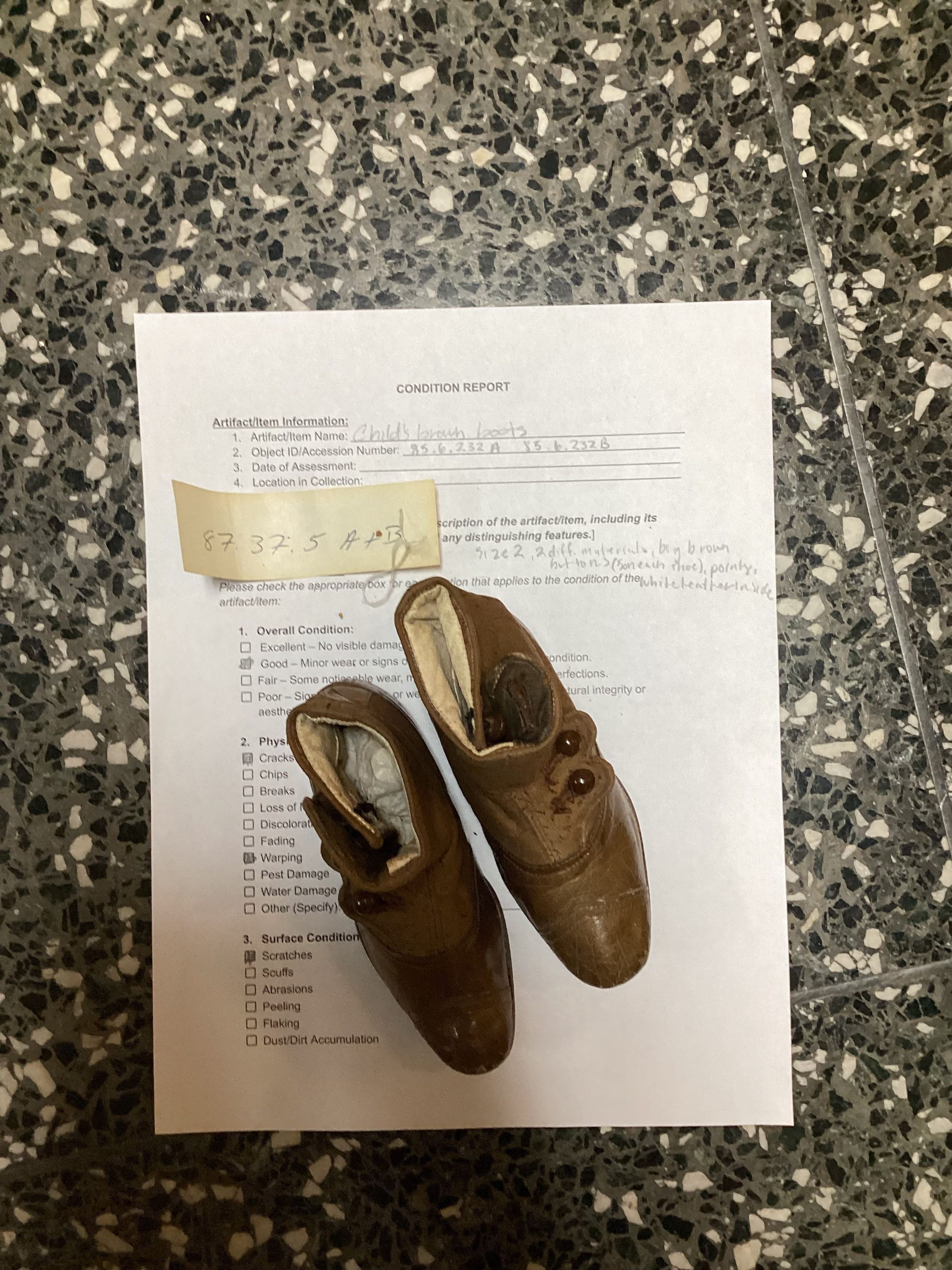 A pair of size 2 1/2 children's high top shoes; tan leather toes and heels, damask tops with 5 metal brown buttons; Right shoe inside marked C 6. Left foot inside 2 1/2 D 1647. Right shoe has two flowers on sole and 2/2 C; Left - one flower 2-D. Sub-numbered A & B.Collection