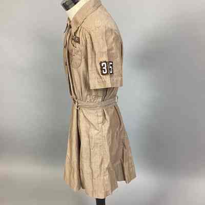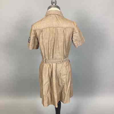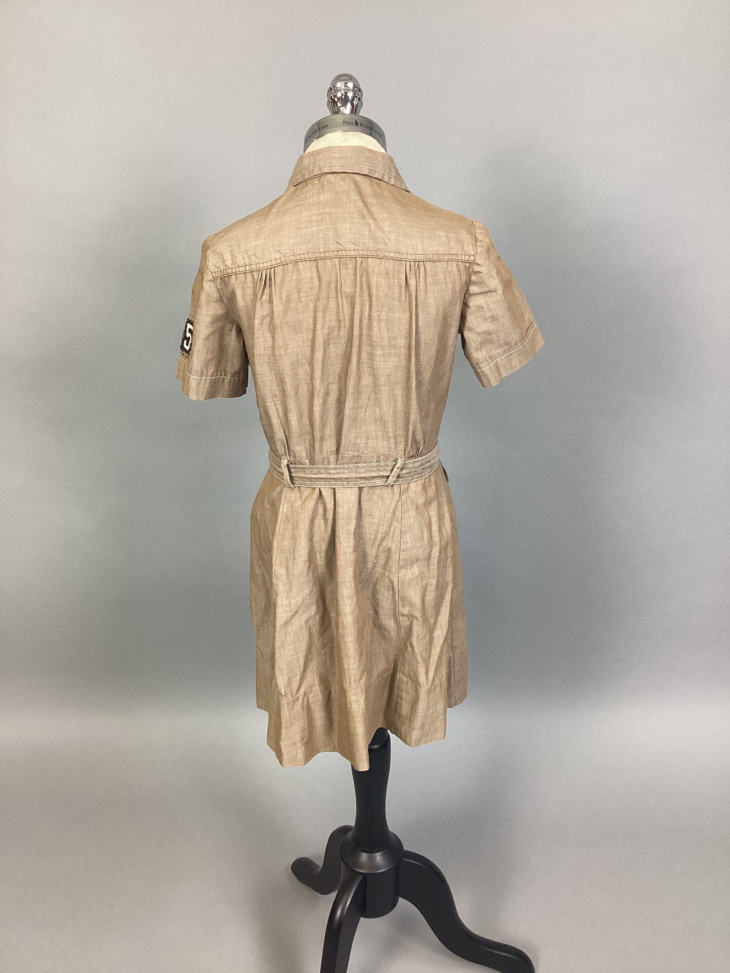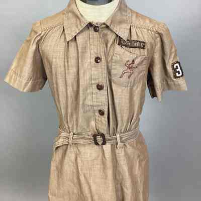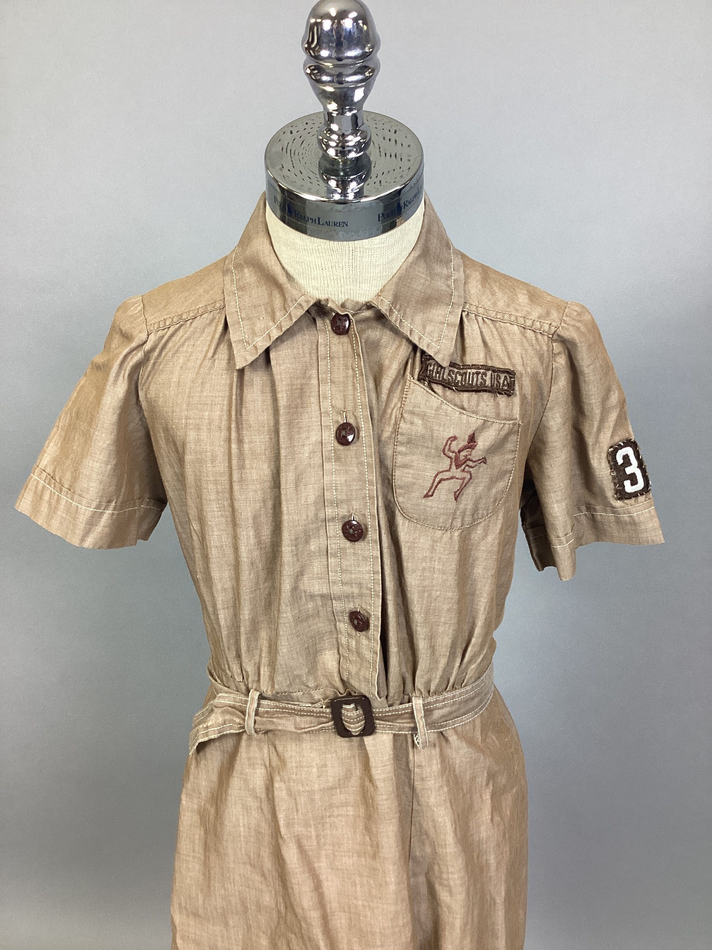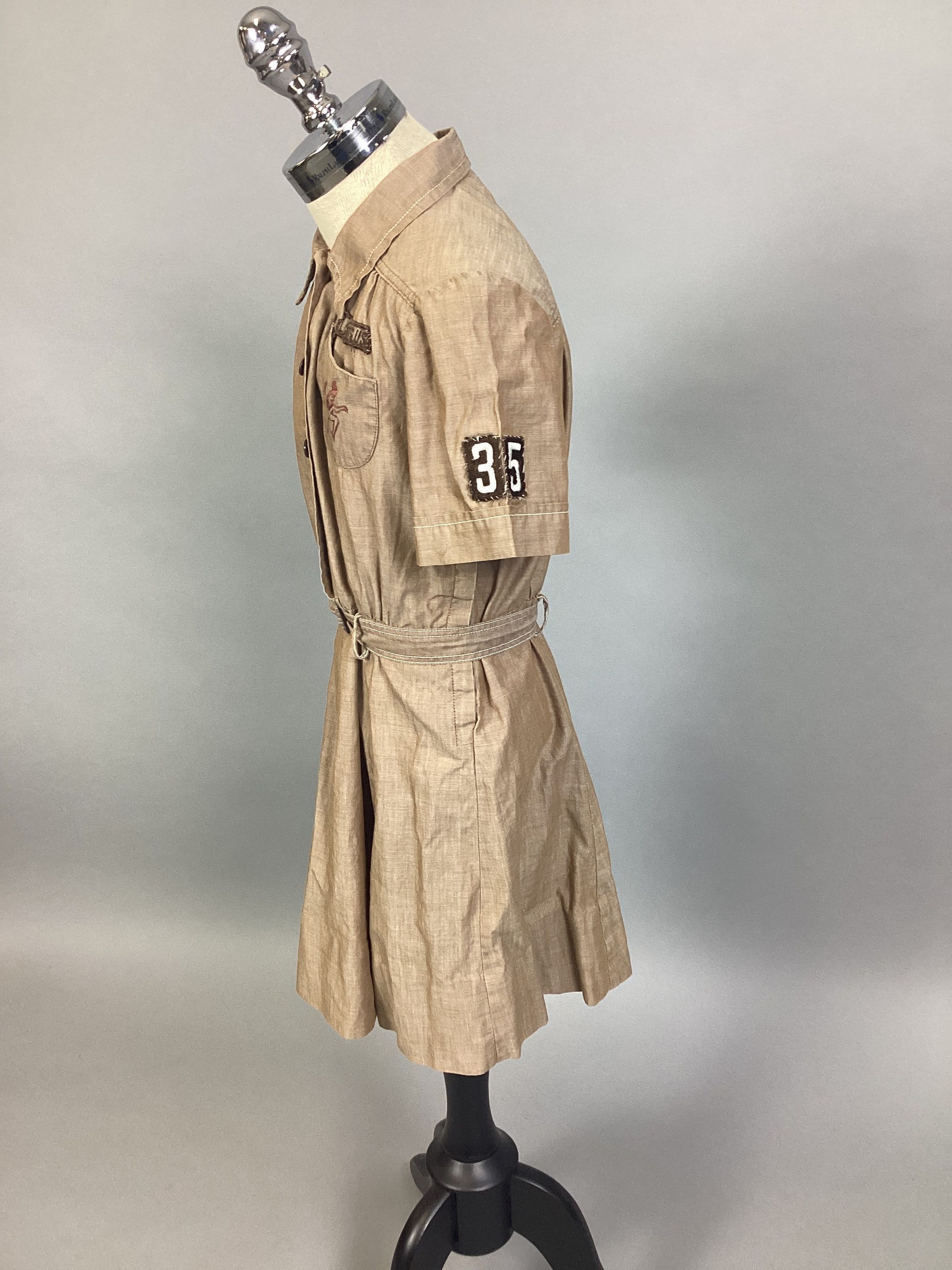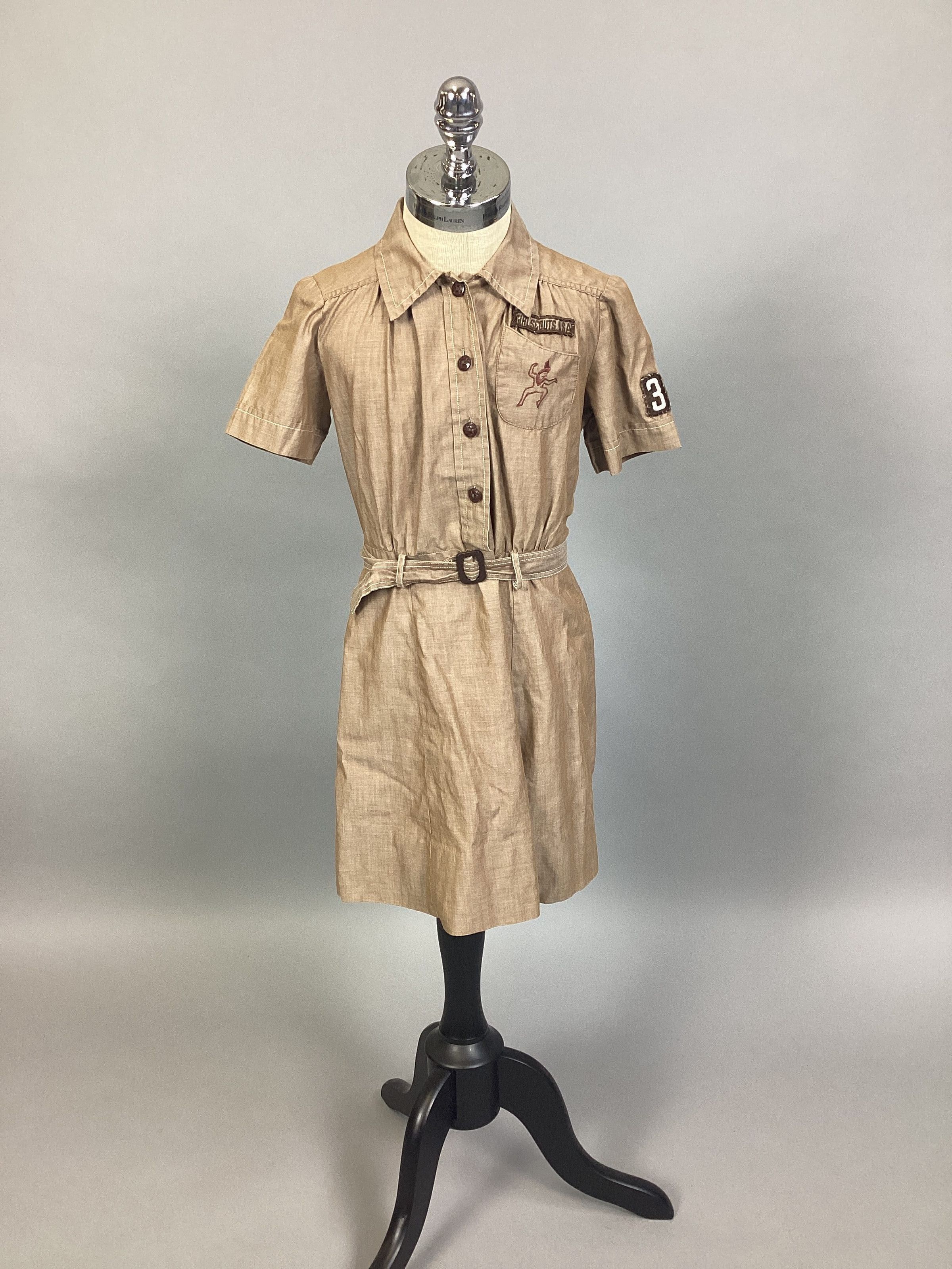 A brown dress with a button-down bodice, short sleeves, and belted waist with brown buckle. The Brownies logo is embroidered on the left breast pocket, with brown embroidery reading "GIRL SCOUTS U.S.A." appearing just above it. A white "33" patch outlined in brown is stitched to the left sleeve.Use