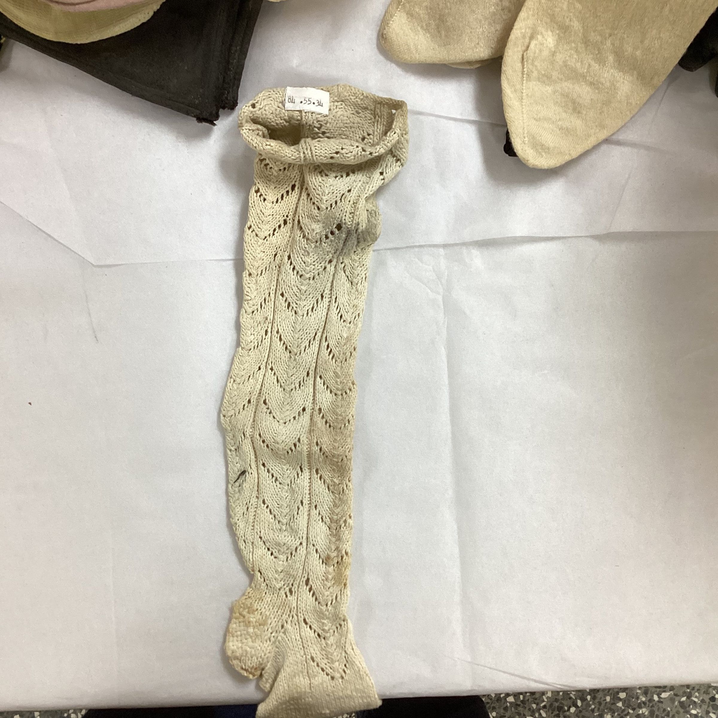 One child's hand knit stocking; foot is 5-1/2" and leg 10"; fitted leg is knit in open stitch with scallop top.Collection