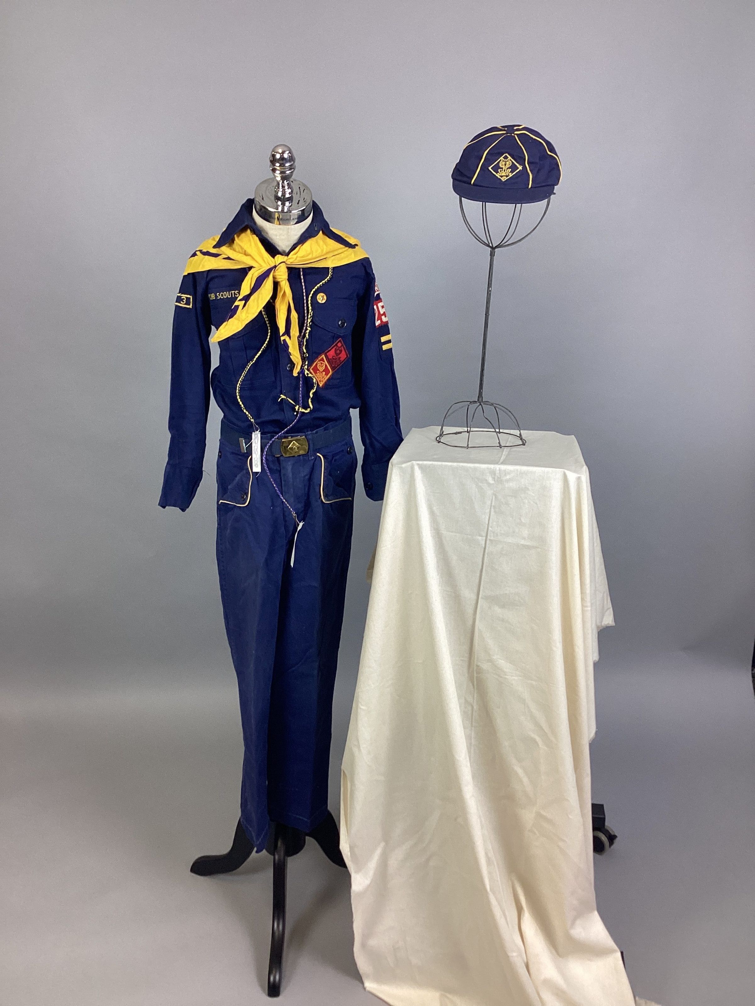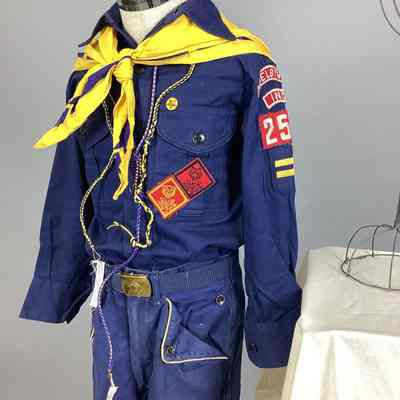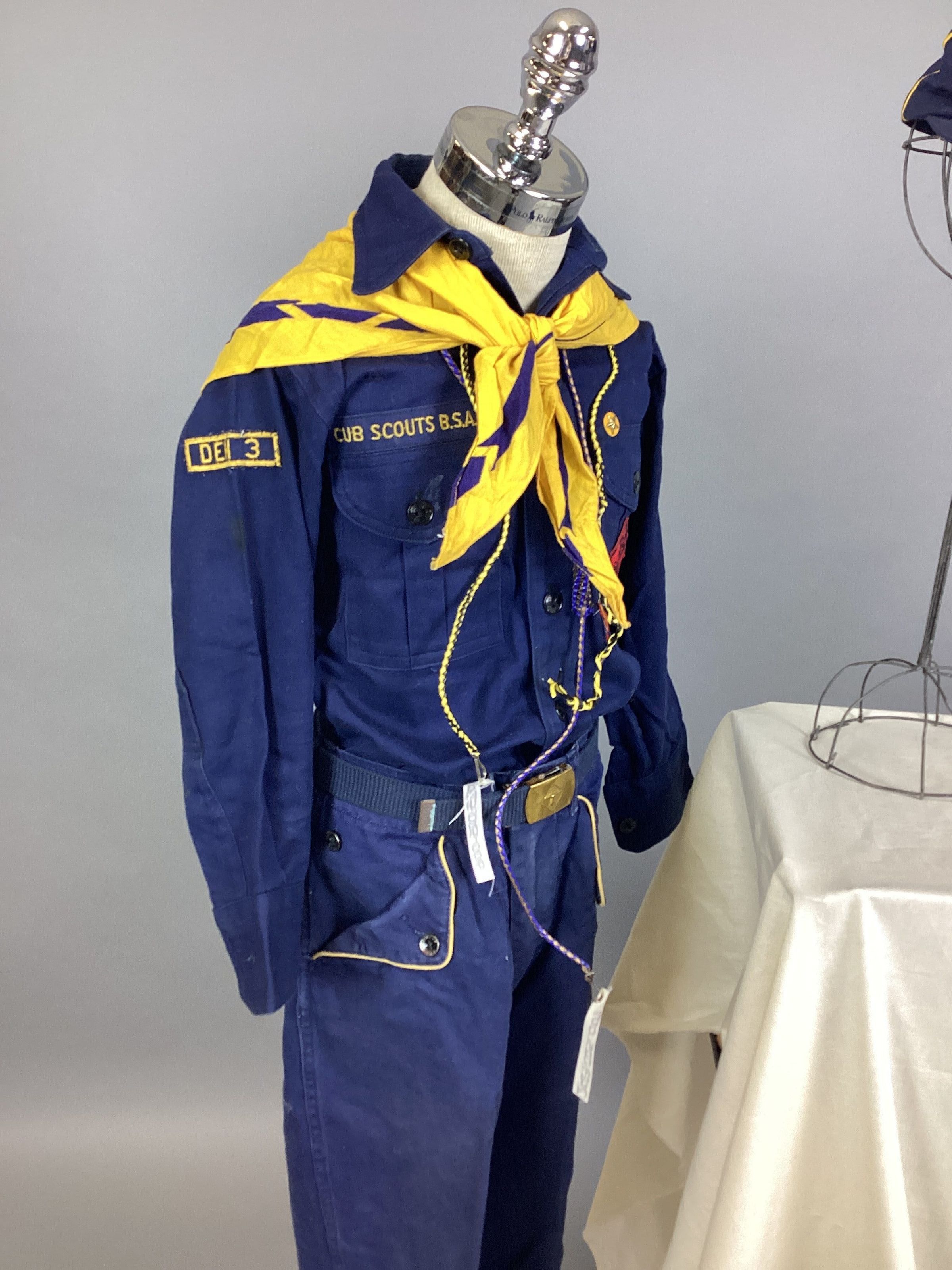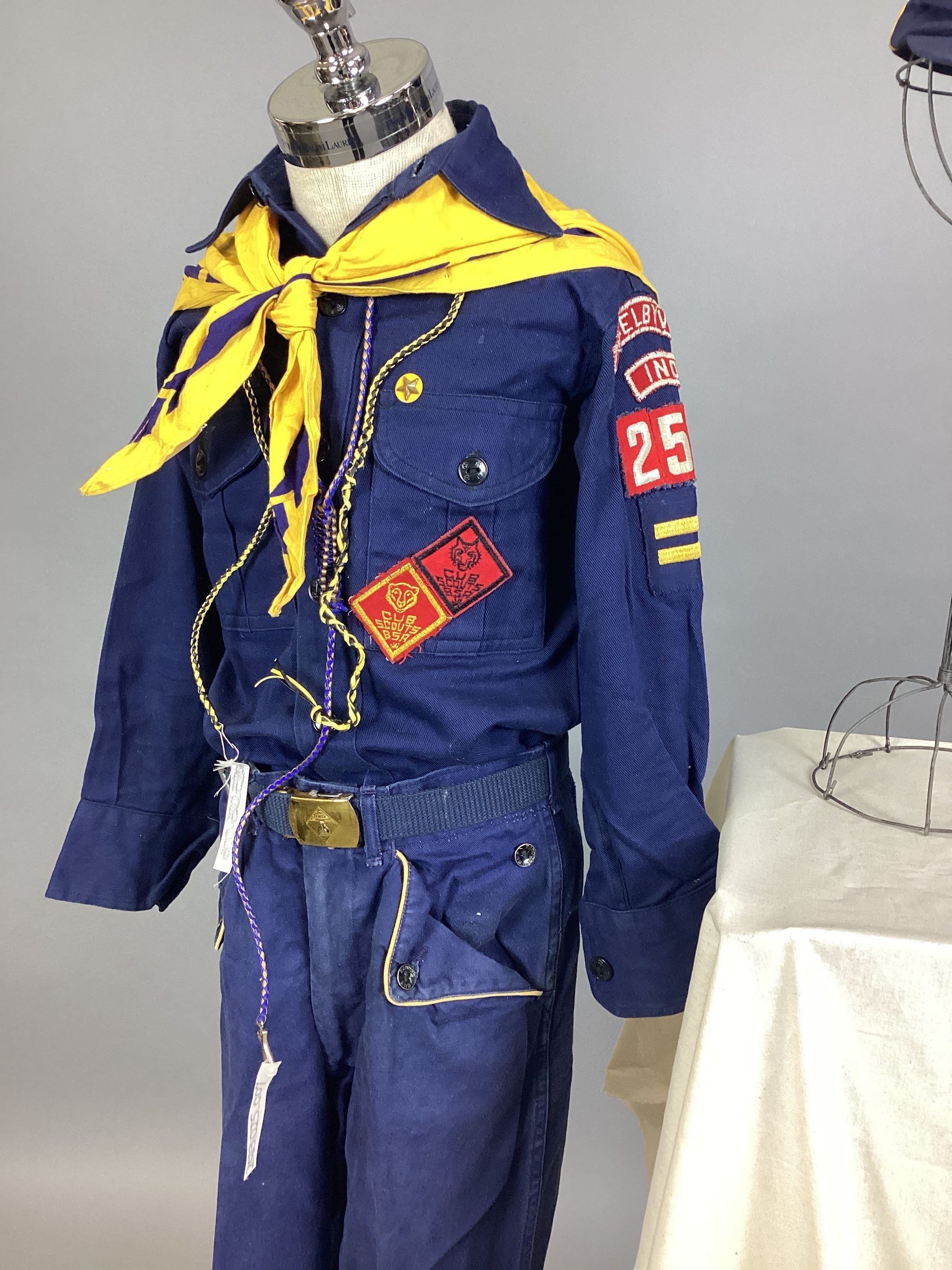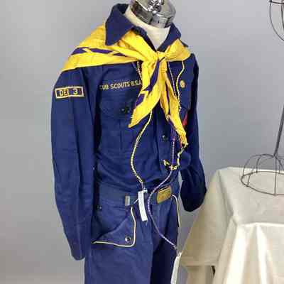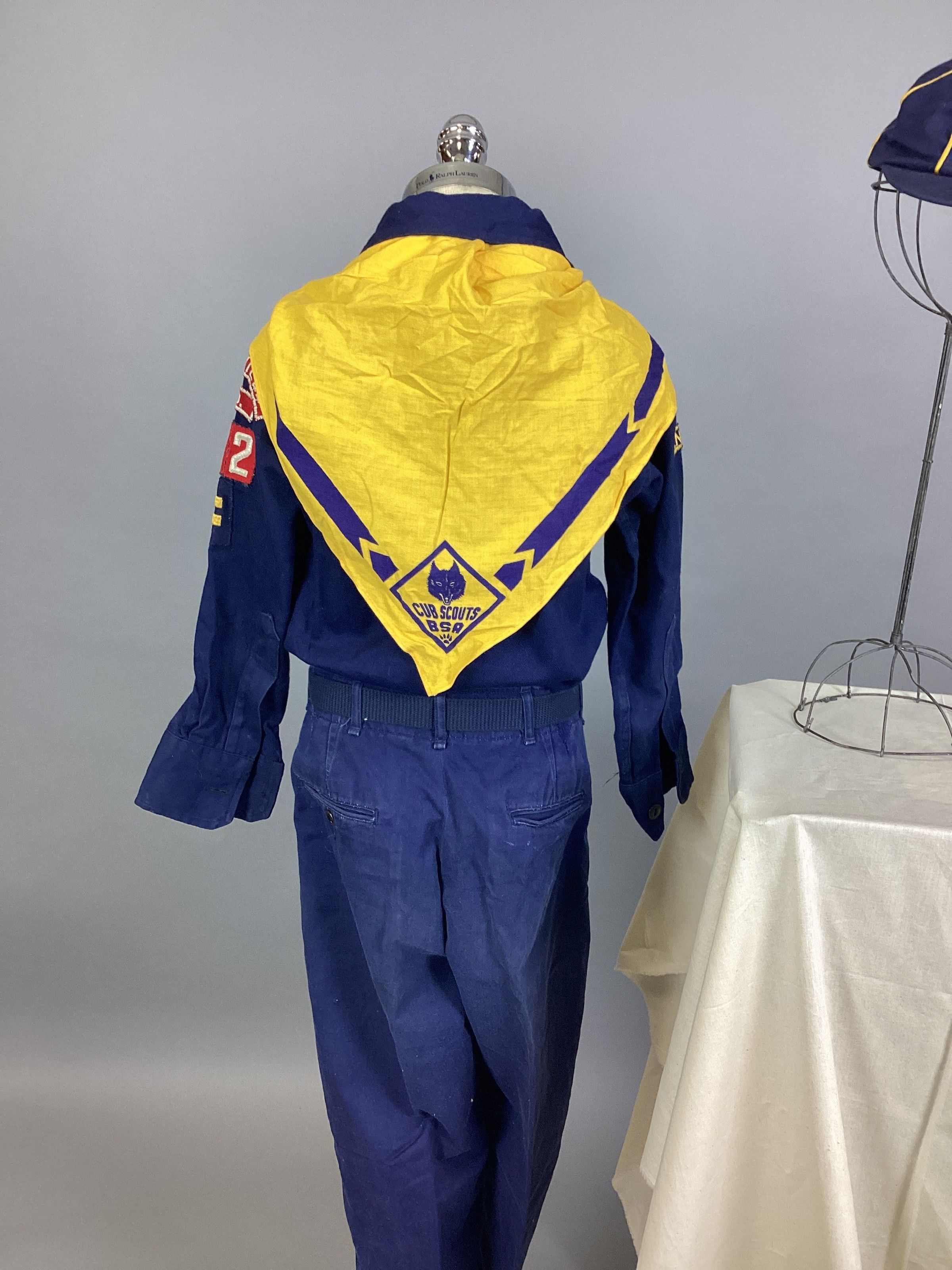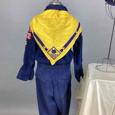 A navy blue and yellow Cub Scout uniform consisting of a shirt, pants, belt, neckerchief, cap, and two hand-tied lanyards. Sub-numbered A-G.