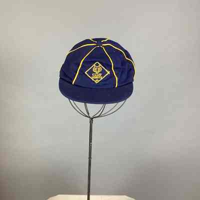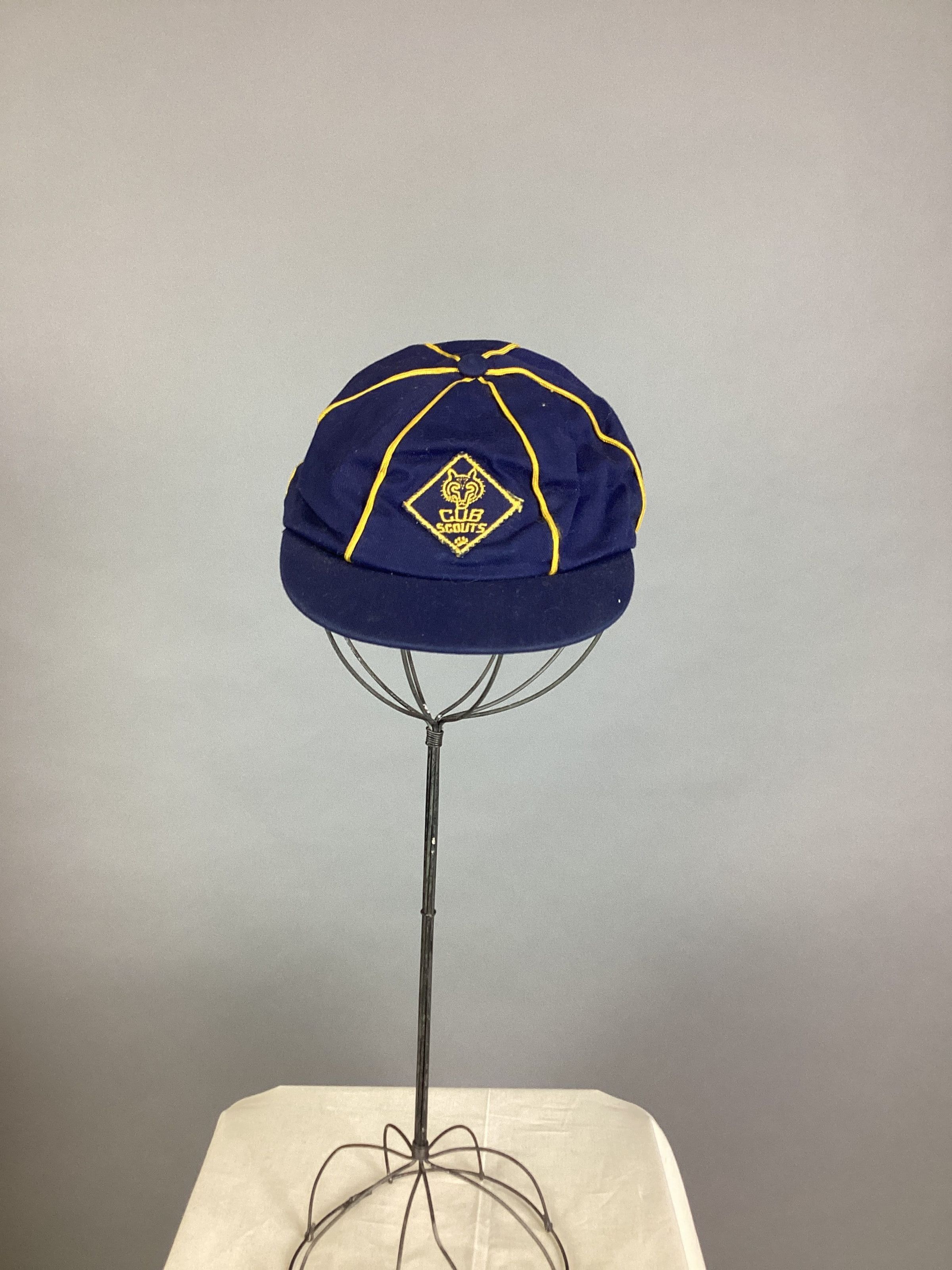 E: Cap; navy blue billed cap with yellow piping, includes Cub Scouts Wolf Badge on front; yellow cloth inside of cap has BSA logo, printed in blue type reading "NAME" with a line, printed on the line is "Sam Roberts"