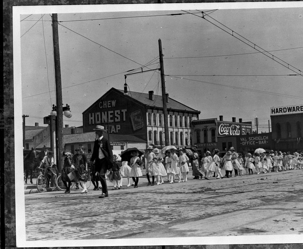 Donation, 07/26/2005. Black and white film negative in landscape format. Image is of young girls in white dresses marching by twos through Public Square. No writing on negative. [see photo # 2005.056.202]Collection