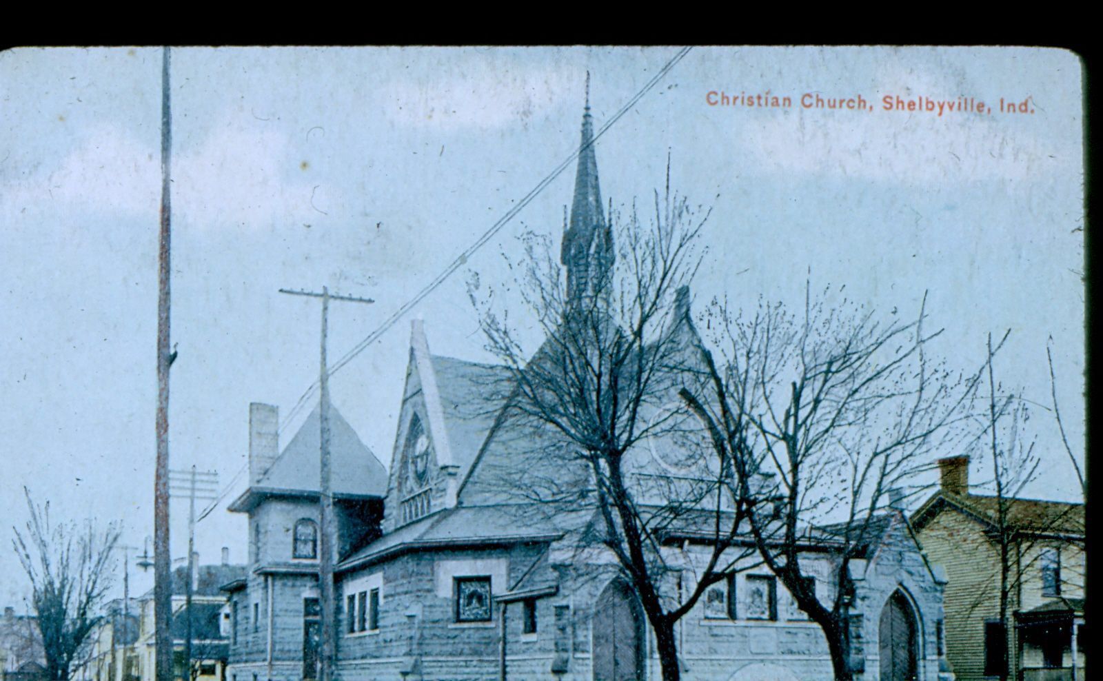 Color-tinted black and white photographic slide in landscape format. Slide frame is marked: "Christian Church." Church is located on the corner of West Washington and North Tomkins Streets.Collection