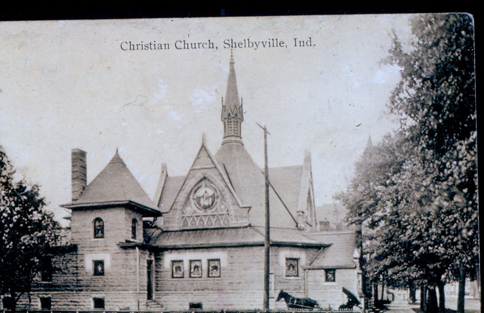 Black and white photographic slide in landscape format. Slide frame is marked: "W. Wash. Christian Church." Caption: "Christian Church, Shelbyville, Ind."Collection