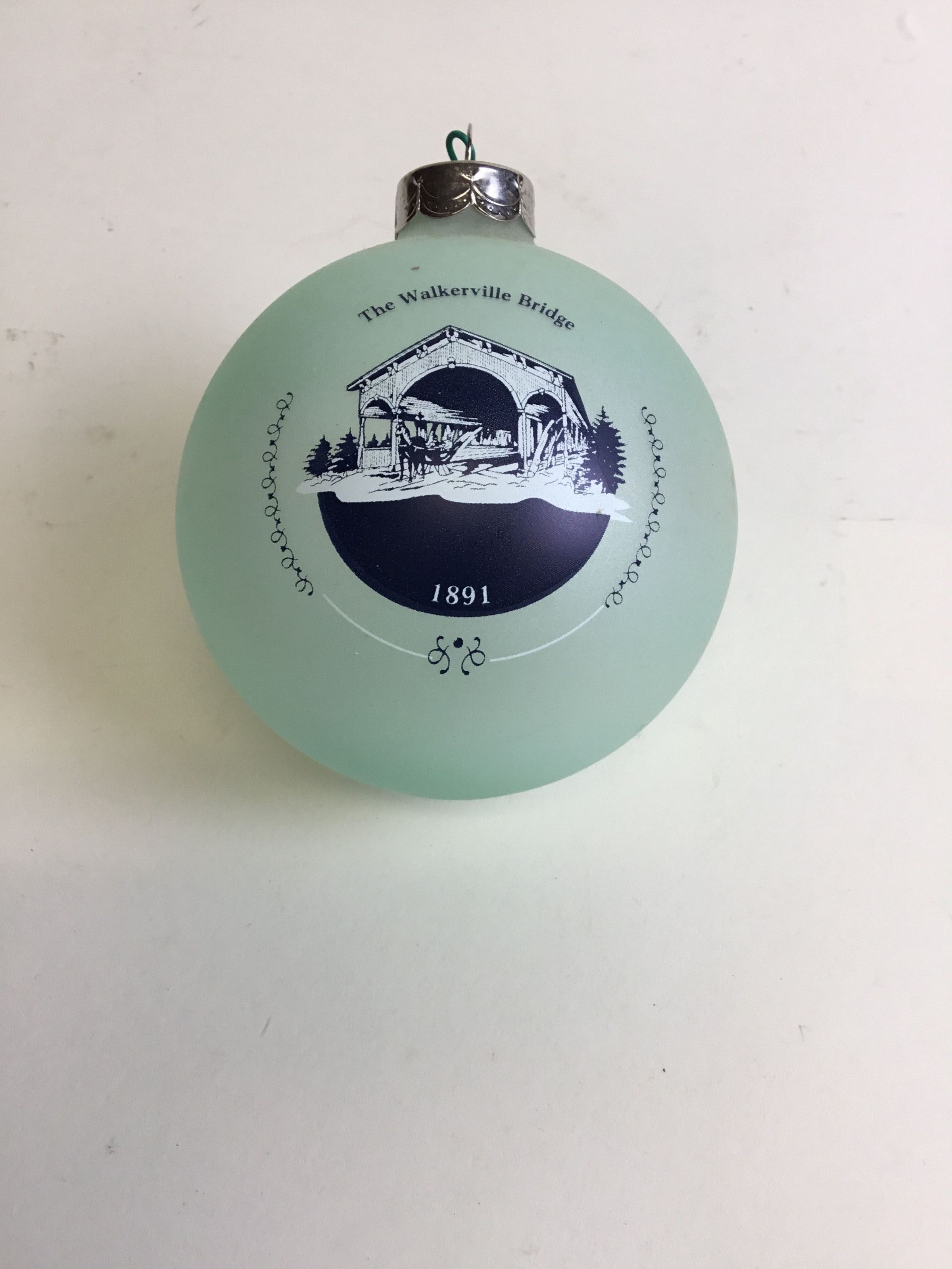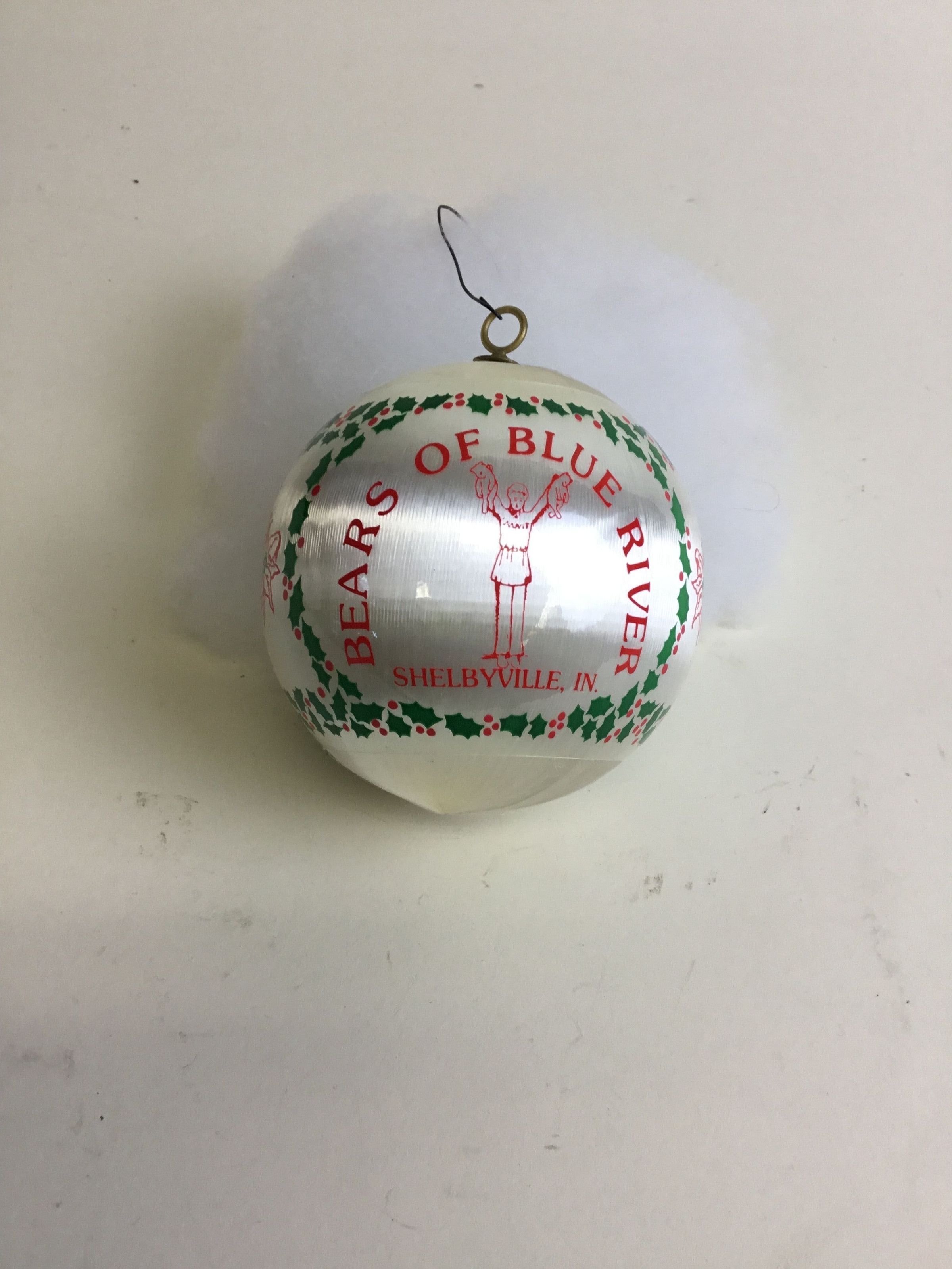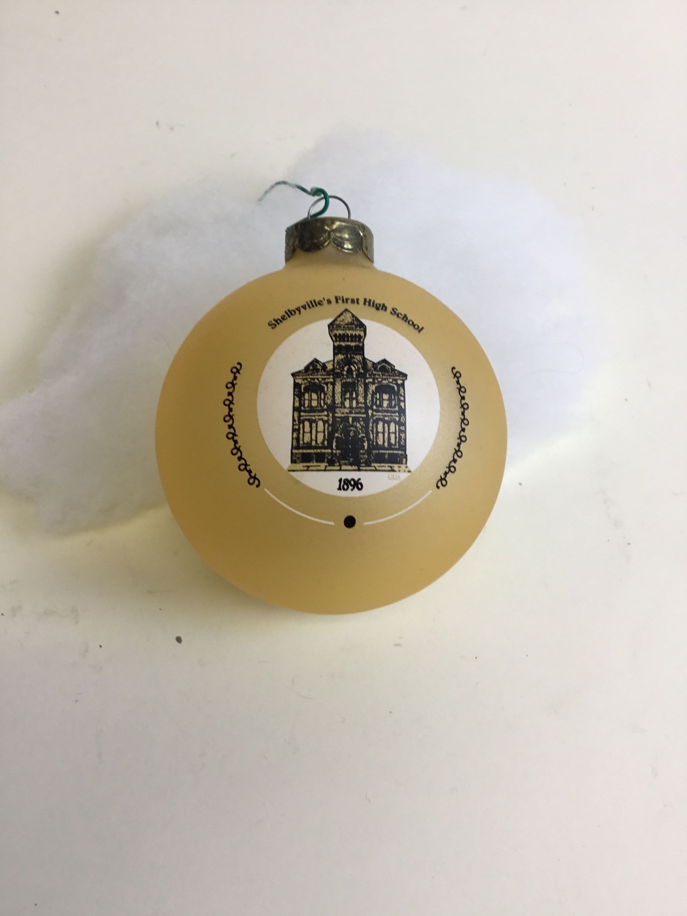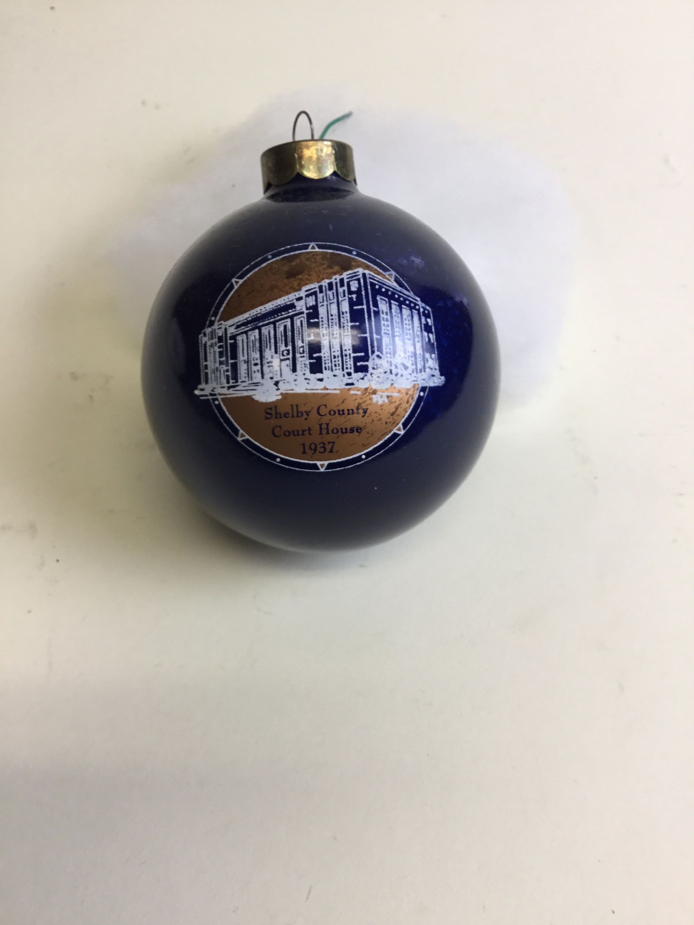 Set of 11 Christmas gala ball ornaments with Shelby County landmarks on them. The boxes are inscribed: Treasured Scenes, Limited Edition Ornaments, Keystone Specialities, Butler, PA.