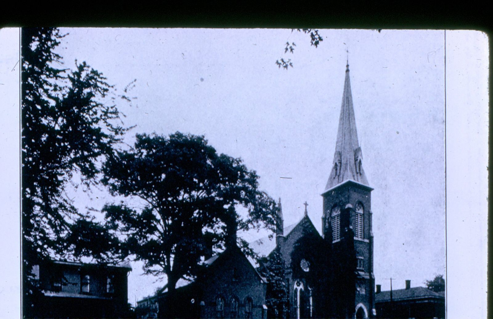 Black and white photographic slide in landscape format. Slide frame is marked: "Pres. Church/