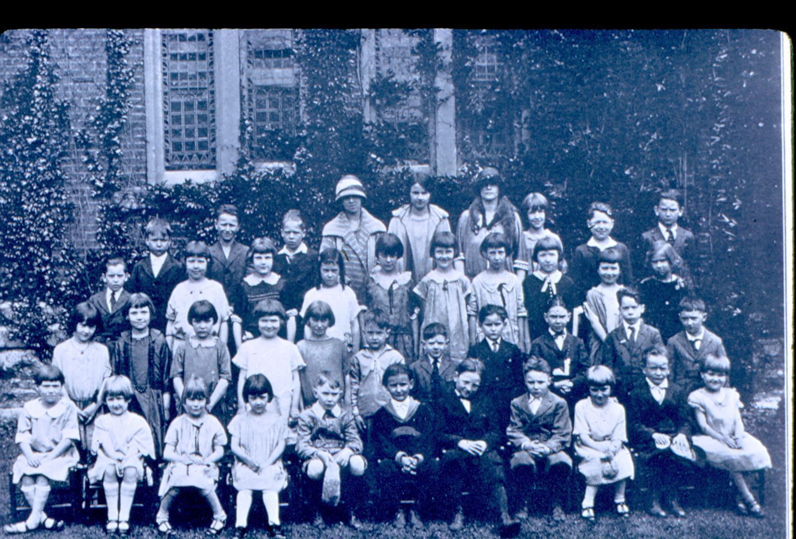 Black and white photographic slide in landscape format. Slide frame is marked: "Primary Dept./1924." Image is of children posed outside a brick building.Collection