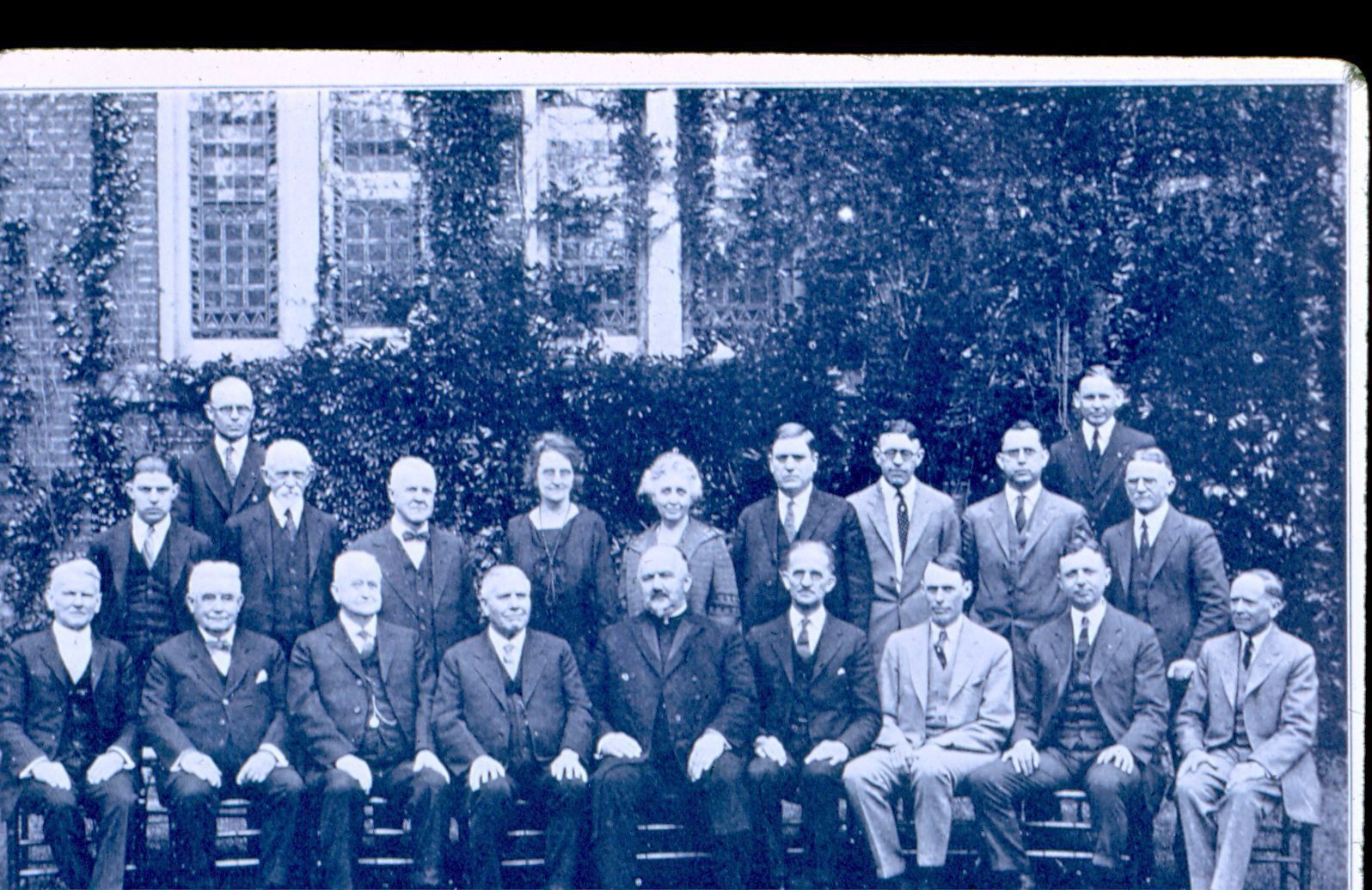 Black and white photographic slide in landscape format. Slide frame is marked: "Officers/ 1924" Image is of people posed outside of a brick building. Church unknown.Collection