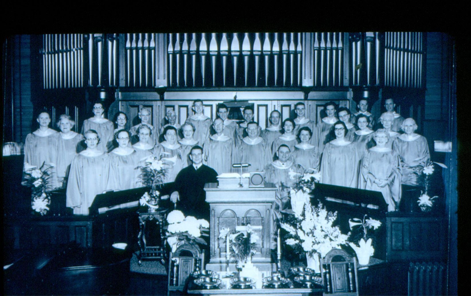 Black and white photographic slide in landscape format. Slide frame is marked: "Choir." Image is of a church choir posed behind the pulpit and in front of the pipes of an organ.Collection