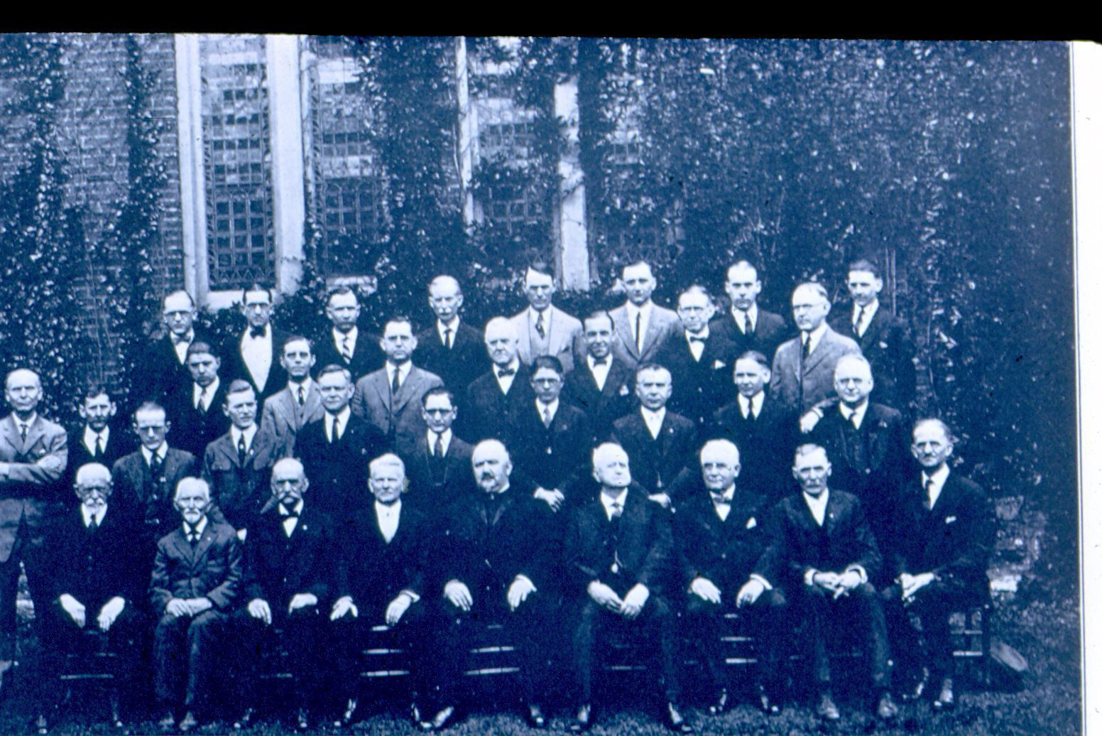 Black and white photographic slide in landscape format. Slide frame is marked: "Men's Bible Class/1924." Image is of a group of men posed outside of a brick building. Church unknown.Collection
