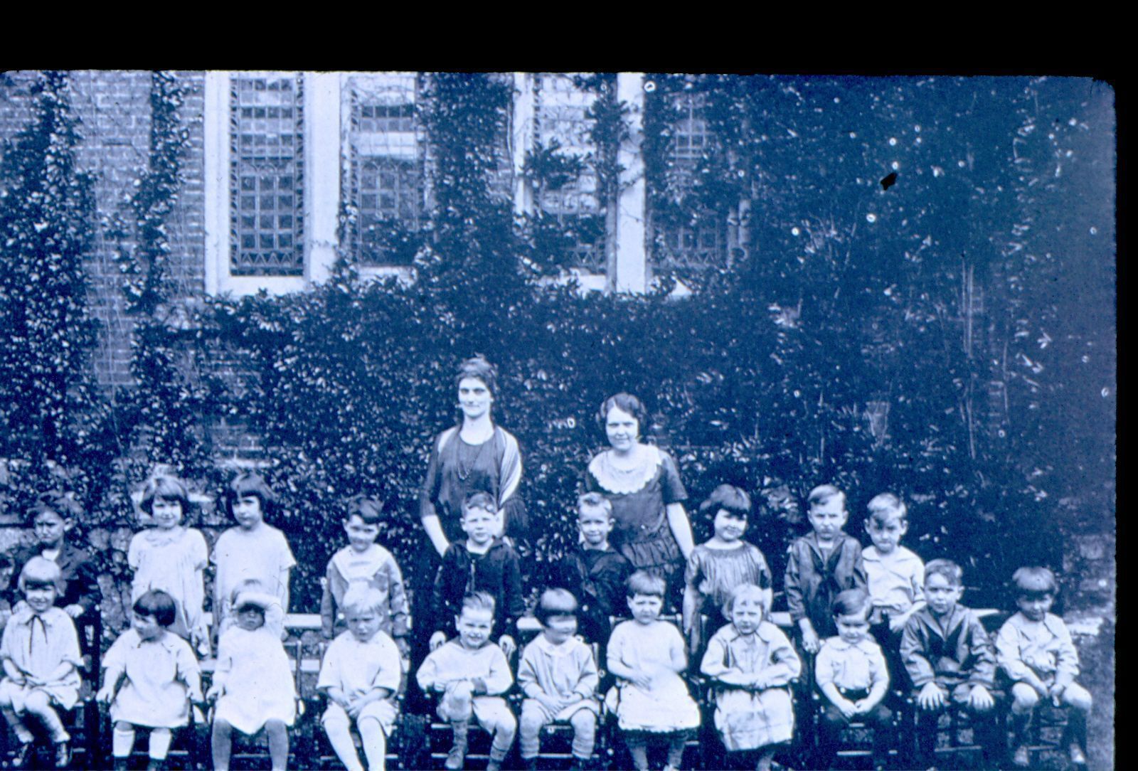 Black and white photographic slide in landscape format. Slide frame is marked: "Beginner's Dept./1924." Toddlers posed outside of a brick building. Church unknown.Collection