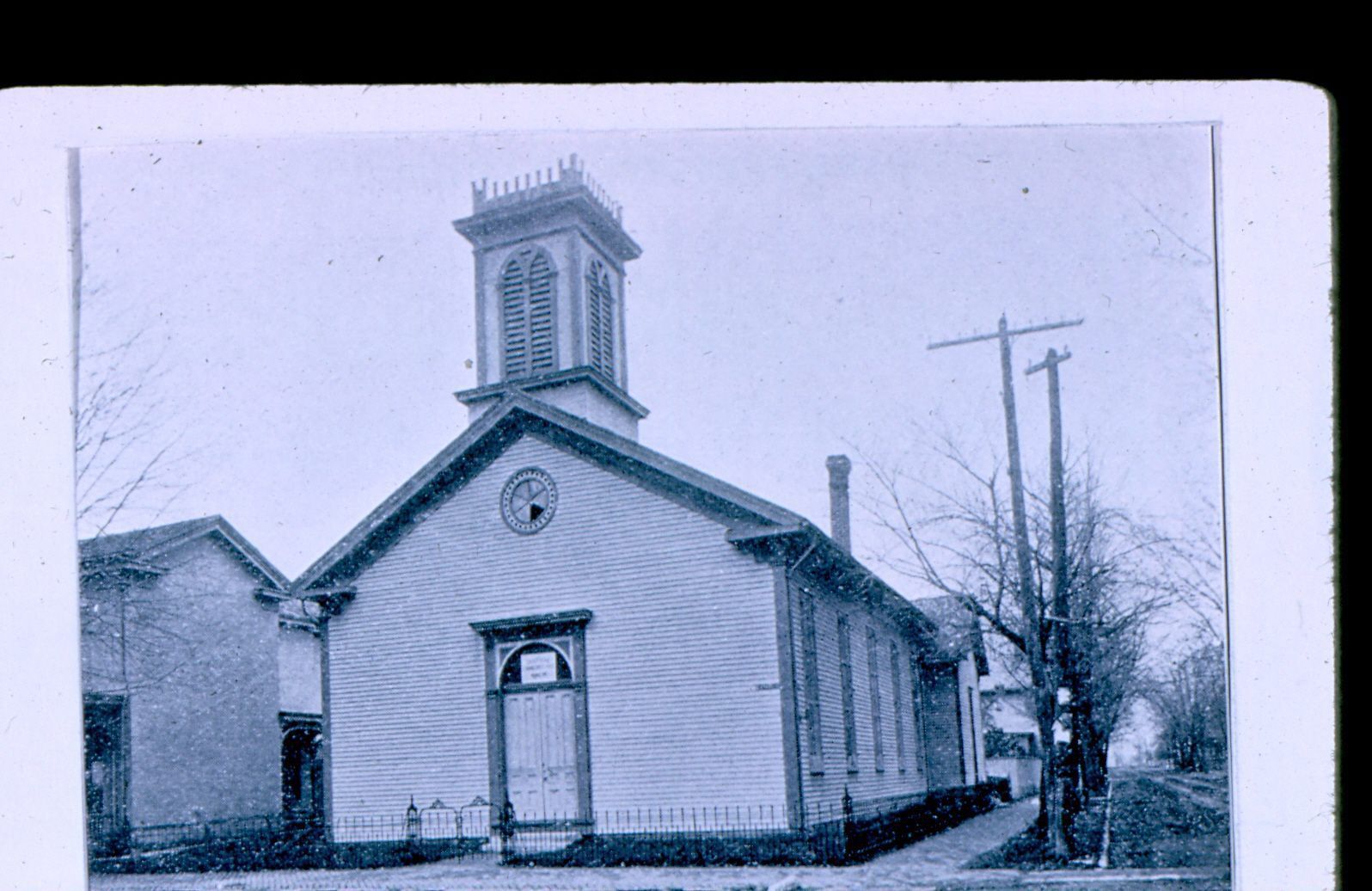 Black and white photographic slide in portrait format. Slide frame is not marked but the image is of a church. This slide is a copy of an older photograph.Collection