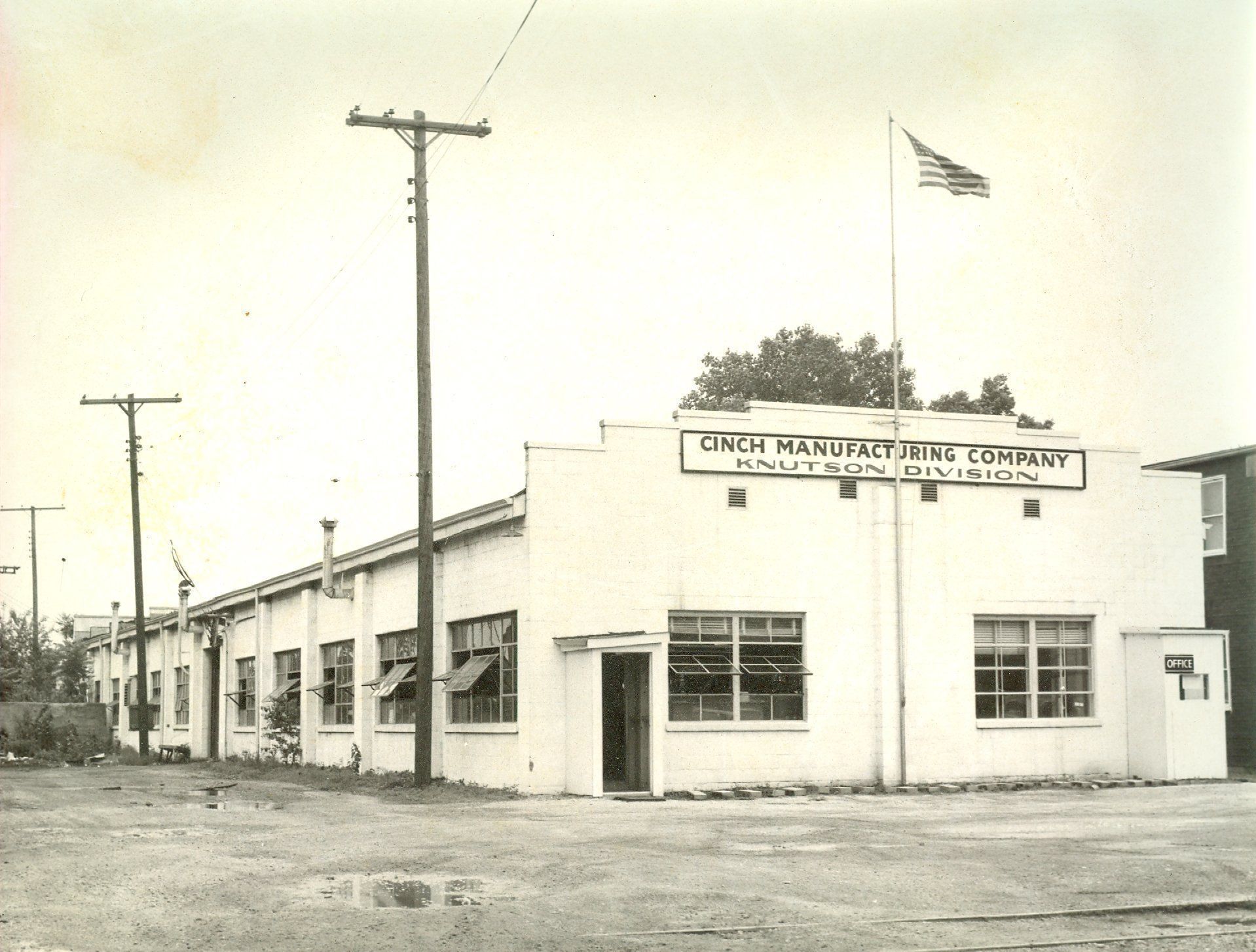 Black and white photograph of of the exterior of Cinch Manufacturing Company. Sign on the building reads: Cinch Manufacturing Company/Knutson Division. Flag pole at the front has the USA flag displayed. Located on East Hendricks. Is now Phelps Auto Sales.Collection