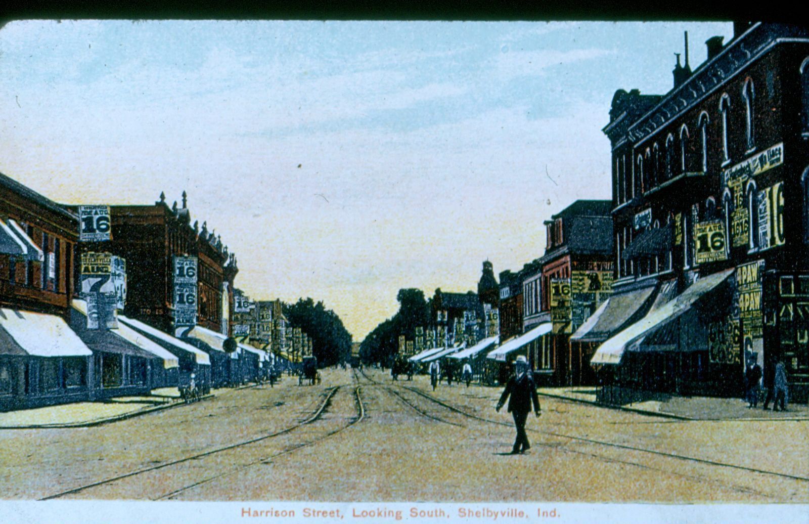 Donation, 07/26/2005. Color photographic slide in landscape format. Slide frame is marked: "S. Harrison looking S." This is a copy of a postcard captioned: "Harrison Street Looking South, Shelbyville, Ind." In the image is evidence of the circus parade route in the signs on the poles, 1907"Collection